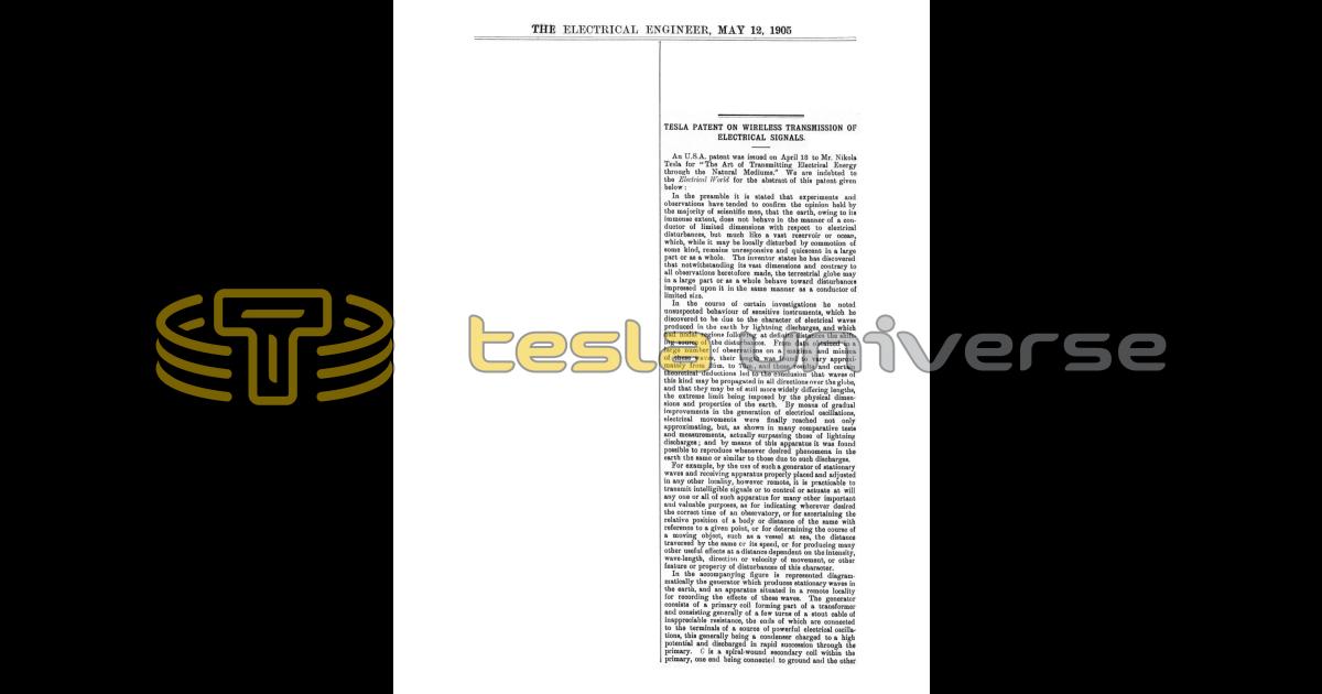 Nikola Tesla Articles Newspaper and magazine articles related to Nikola Tesla Tesla Patent on Wireless Transmission of Electrical Signals (reprint) Electrical Engineer May 12th, 1905 Page number(s): 670-671 This article is a reprint from Electrical World and Engineer of April 29, 1905 and is intentionally not duplicated here. Downloads Downloads for this article are available to members.Log in or join today to access all content. Downloads Downloads for this article are available to members.Log in or join today to access all content. Pagination Enjoy other articles First First item Previous Previous item Next Next item Last Last item Within the Universe Timeline Important moments and events related to Tesla. Articles Nikola Tesla in the press. Books Books written by and about Nikola Tesla. Documents Nikola Tesla documents, files and papers. Quotes Profound and insightful quotes by Nikola Tesla. Movies and TV Nikola Tesla on the screen. Patents Nikola Tesla held around 200 patents worldwide. Landmarks Locations related to Nikola Tesla. Images Nikola Tesla image and photo library. Show more Pagination Enjoy other articles First First item Previous Previous item Next Next item Last Last item Within the Universe Documents Nikola Tesla documents, files and papers. Quotes Profound and insightful quotes by Nikola Tesla. Books Books written by and about Nikola Tesla. Timeline Important moments and events related to Tesla. Patents Nikola Tesla held around 200 patents worldwide. Images Nikola Tesla image and photo library. Landmarks Locations related to Nikola Tesla. Letters Letters to, from and about Nikola Tesla. Movies and TV Nikola Tesla on the screen.