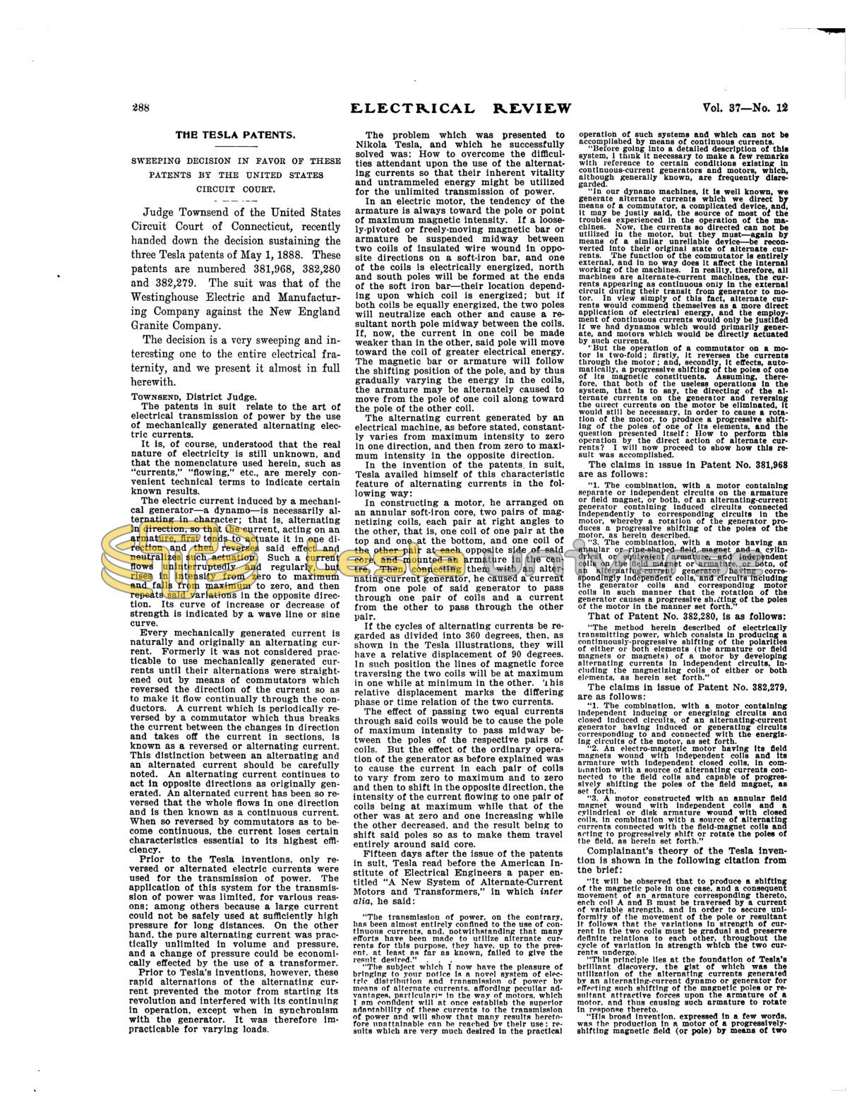 Judge Townsend of the United States Circuit Court of Connecticut, recently handed down the decision sustaining the three Tesla patents of May 1, 1888. These patents are numbered 381,968, 382,280 and 382,279. The suit was that of the Westinghouse Electric and Manufacturing Company against the New England Granite Company.