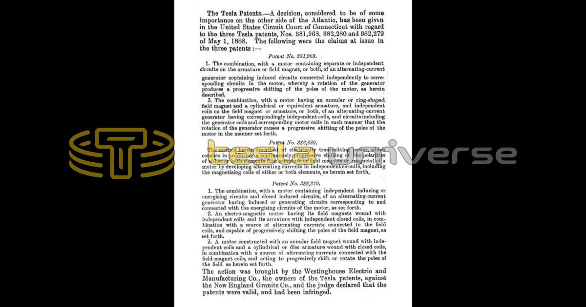 The action was brought by the Westinghouse Electric and Manufacturing Co., the owners of the Tesla patents, against the New England Granite Co., and the judge declared that the patents were valid, and had been infringed.