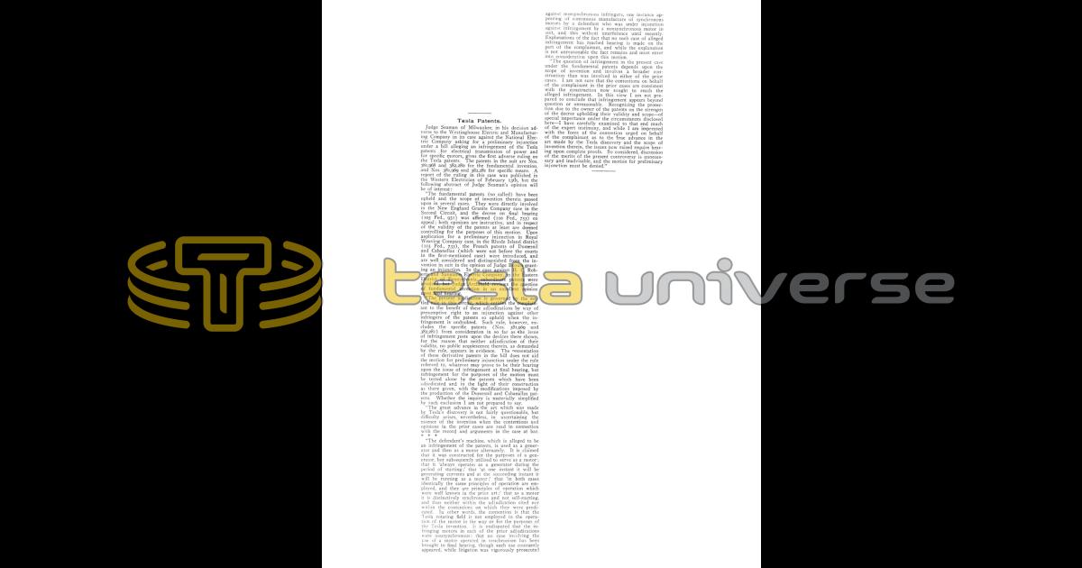 Judge Seaman of Milwaukee, in his decision adverse to the Westinghouse Electric and Manufacturing Company in its case against the National Electric Company asking for a preliminary injunction under a bill alleging an infringement of the Tesla patents for electrical transmission of power and for specific motors, gives the first adverse ruling on the Tesla patents. The patents in the suit are Nos. 381,968 and 382,280 for the fundamental invention, and Nos. 381,969 and 382,281 for specific means. A report of the ruling in this case was published in the Western Electrician of February 13th, but the following abstract of Judge Seaman's opinion will be of interest: