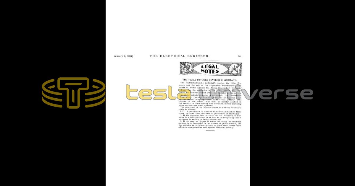 The Elektrotechnische Zeitschrift quoting the Köln. Ztg. states that the suit of the Allgemeine Elektric ts-Gesellschaft of Berlin against the Aktien-Gesellschaft Helios of Cologne, for the revocation of the Tesla patents was tried before the German Patent Office and resulted in the revocation of the patents according to paragraph 11 of the German Patent Laws. The case will be appealed to the Imperial Court by the Helios Company. Just what "Tesla patents" were revoked is not stated. The term is usually applied in this country to those dealing with induction motors requiring phase currents for their operation.