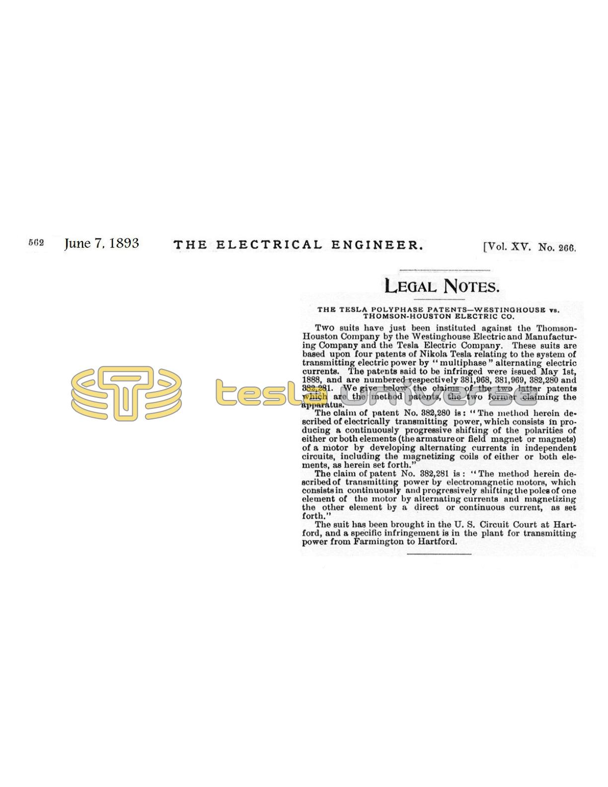 Two suits have just been instituted against the ThomsonHouston Company by the Westinghouse Electric and Manufacturing Company and the Tesla Electric Company. These suits are based upon four patents of Nikola Tesla relating to the system of transmitting electric power by "multiphase" alternating electric currents. The patents said to be infringed were issued May 1st, 1888, and are numbered respectively 381,968, 381,969, 382,280 and 382,281. We give below the claims of the two latter patents which are the method patents, the two former claiming the apparatus.