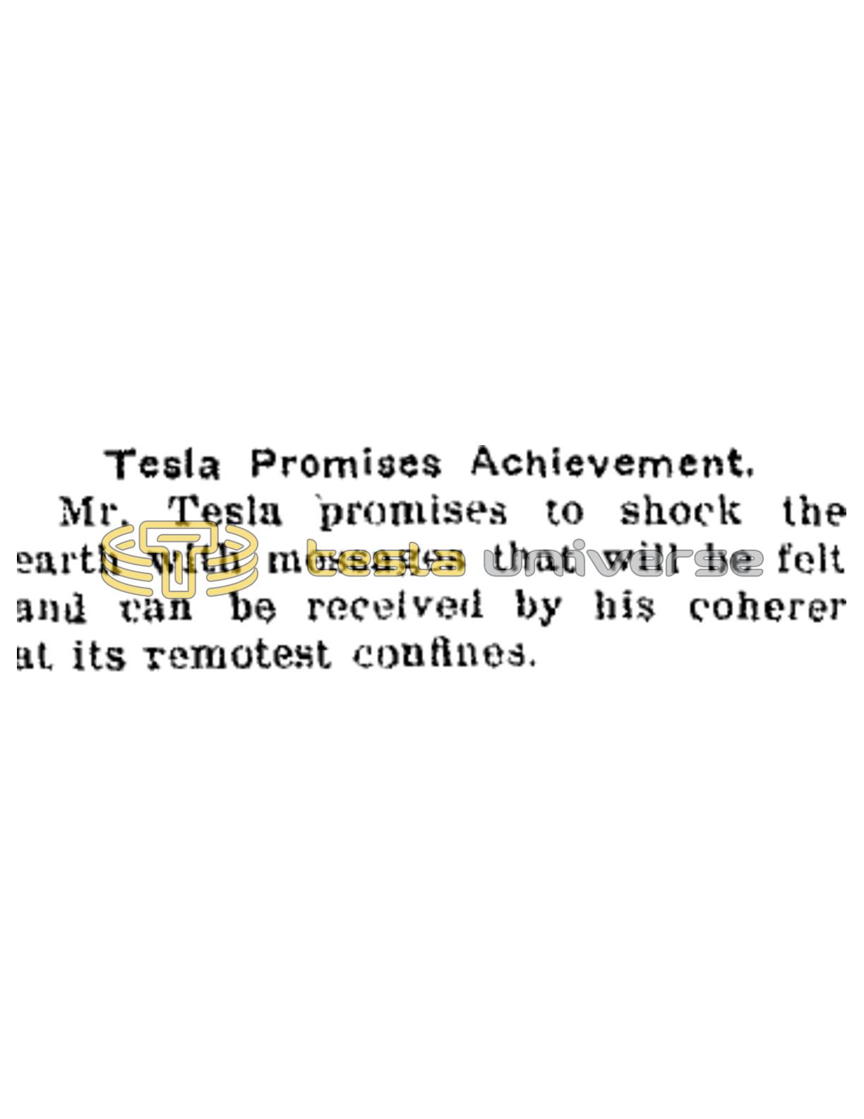 Nikola Tesla Articles Newspaper and magazine articles related to Nikola Tesla Tesla Promises Achievement Elbert County Banner July 24th, 1903 Page number(s): 4 Mr. Tesla promises to shock the earth with messages that will be felt and can be received by his coherer at its remotest confines. Downloads Downloads for this article are available to members.Log in or join today to access all content. Downloads Downloads for this article are available to members.Log in or join today to access all content. Pagination Enjoy other articles First First item Previous Previous item Next Next item Last Last item Within the Universe Timeline Important moments and events related to Tesla. Articles Nikola Tesla in the press. Books Books written by and about Nikola Tesla. Documents Nikola Tesla documents, files and papers. Quotes Profound and insightful quotes by Nikola Tesla. Movies and TV Nikola Tesla on the screen. Patents Nikola Tesla held around 200 patents worldwide. Landmarks Locations related to Nikola Tesla. Images Nikola Tesla image and photo library. Show more Pagination Enjoy other articles First First item Previous Previous item Next Next item Last Last item Within the Universe Documents Nikola Tesla documents, files and papers. Quotes Profound and insightful quotes by Nikola Tesla. Books Books written by and about Nikola Tesla. Timeline Important moments and events related to Tesla. Patents Nikola Tesla held around 200 patents worldwide. Images Nikola Tesla image and photo library. Landmarks Locations related to Nikola Tesla. Letters Letters to, from and about Nikola Tesla. Movies and TV Nikola Tesla on the screen.