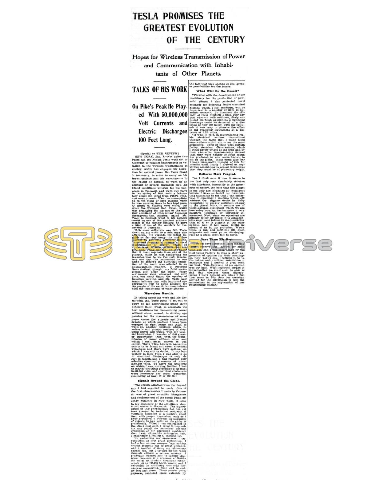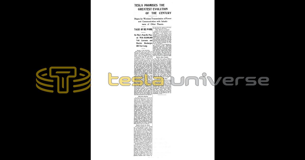NEW YORK, Jan. 2.—Not quite two years ago Mr. Nikola Tesla went out to Colorado to conduct experiments in relation to the wireless transmission of energy, which has engaged his attention for several years. Mr. Tesla found it necessary, in order to carry on his investigations and his experiments to the extent he desired, to work at an altitude of several thousand feet. He found conditions suitable for his purposes in Colorado and went out there in the spring of 1899, built a laboratory about ten miles from Pike’s Peak, and went to work. What he accomplished in the eight or nine months while he was working there has been pretty much to himself ever since; but when the National Red Cross, which was arranging for the end of the century, meetings of the various branches throughout the country, asked Mr. Tesla to indicate what in his opinion would be one of the greatest achievements of the coming century, he gave a hint of one of the wonders he discovered in Colorado.