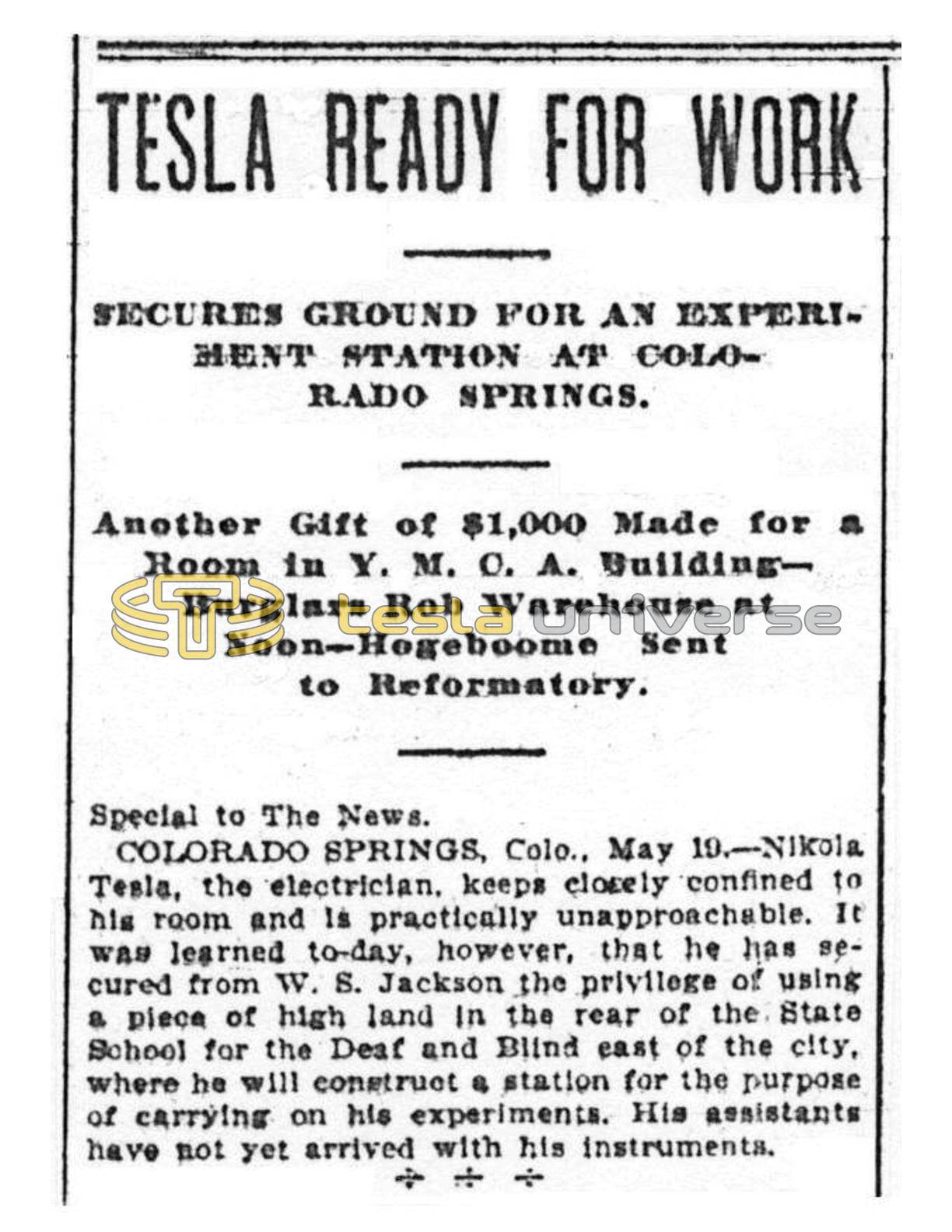 Colorado Springs, Colo., May 19. - Nikola Tesla, the electrician, keeps closely confined to his room and is practically unapproachable. It was learned to-day, however, that he has secured from W. S. Jackson the privilege of using a piece of high land in the rear of the State School for the Deaf and Blind east of the city, where he will construct a station for the purpose of carrying on his experiments. His assistants have not yet arrived with his instruments.