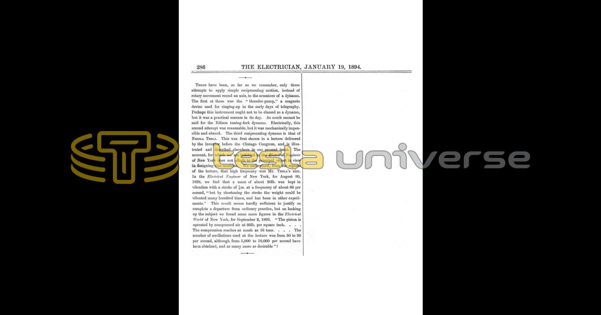 There have been, so far as we remember, only three attempts to apply simple reciprocating motion, instead of rotary movement round an axis, to the armature of a dynamo. The first of these was the "thunder-pump," a magneto device used for ringing-up in the early days of telegraphy. Perhaps this instrument ought not to be classed as a dynamo, but it was a practical success in its day. As much cannot be said for the Edison tuning-fork dynamo. Electrically, this second attempt was reasonable, but it was mechanically impossible and absurd. The third reciprocating dynamo is that of Nikola Tesla. This was first shown in a lecture delivered by the inventor before the Chicago Congress, and is illustrated and described elsewhere in our present issue. The account, for which we are indebted to the Electrical Engineer of New York does not allude to the principal object in view in designing this machine. We understand, from the reports of the lecture, that high frequency was Mr. Tesla's aim. In the Electrical Engineer of New York, for August 30, 1893, we find that a mass of about 20lb. was kept in vibration with a stroke of in. at a frequency of about 80 per second, "but by shortening the stroke the weight could be vibrated many hundred times, and has been in other experiments." This result seems hardly sufficient to justify so, complete a departure from ordinary practice, but on looking up the subject we found some more figures in the Electrical World of New York, for September 2, 1893. "The piston is operated by compressed air at 60lb. per square inch. The compression reaches as much as 16 tons. The number of oscillations used at the lecture was from 50 to 90 per second, although from 5,000 to 10,000 per second have been obtained, and as many more as desirable "!
