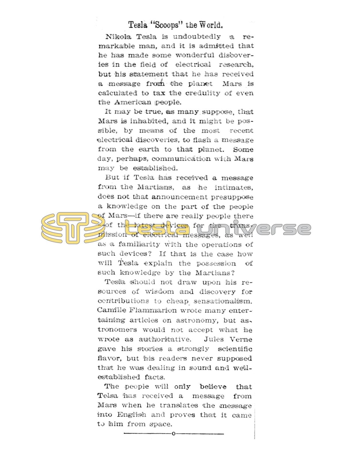 Nikola Tesla is undoubtedly (a remarkable man, and it is admitted that he has made some wonderful discoveries in the field of electrical research, but his statement that he has received a message from the planet Mars is calculated to tax the credulity of even the American people.
