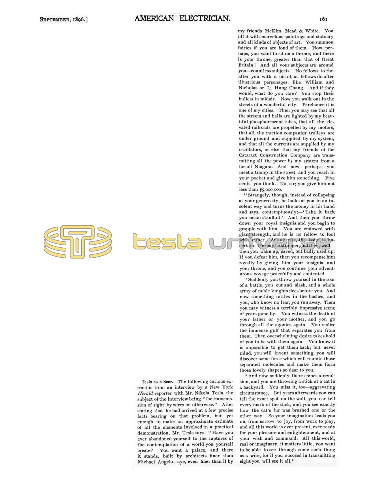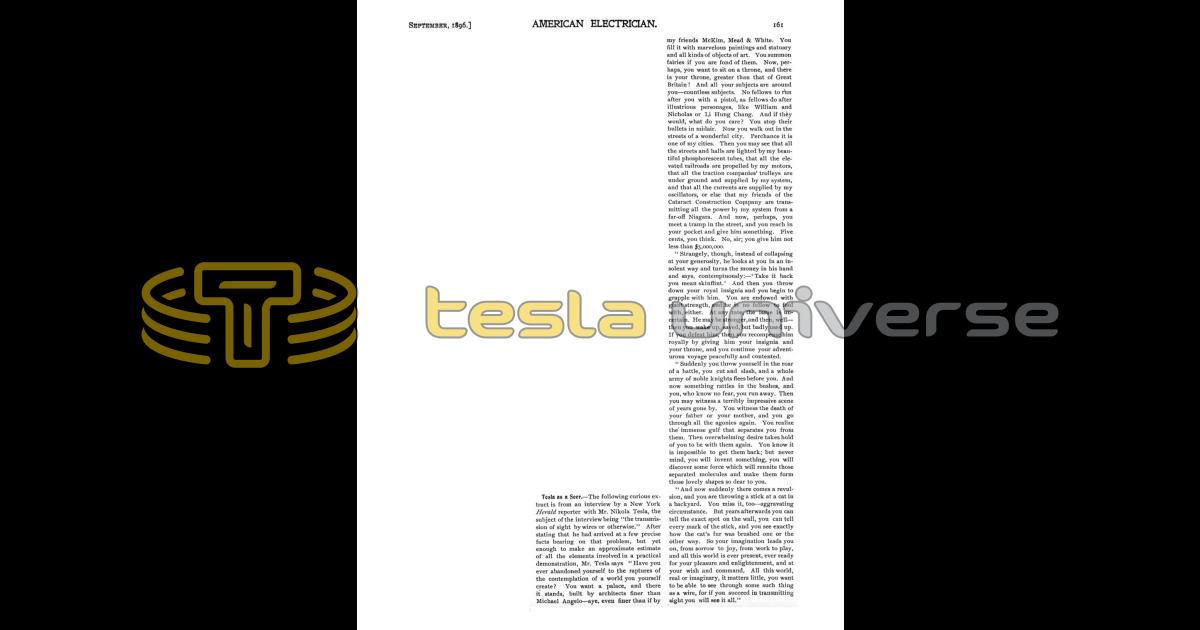 The following curious extract is from an interview by a New York Herald reporter with Mr. Nikola Tesla, the subject of the interview being "the transmission of sight by wires or otherwise." After stating that he had arrived at a few precise facts bearing on that problem, but yet enough to make an approximate estimate of all the elements involved in a practical demonstration, Mr. Tesla says "Have you ever abandoned yourself to the raptures of the contemplation of a world you yourself create? You want a palace, and there it stands, built by architects finer than Michael Angelo — aye, even finer than if by my friends McKim, Mead & White. You fill it with marvelous paintings and statuary and all kinds of objects of art. You summon fairies if you are fond of them. Now, perhaps, you want to sit on a throne, and there is your throne, greater than that of Great Britain! And all your subjects are around you — countless subjects. No fellows to run after you with a pistol, as fellows do after illustrious personages, like William and Nicholas or Li Hung Chang. And if they would, what do you care? You stop their bullets in midair. Now you walk out in the streets of a wonderful city. Perchance it is one of my cities. Then you may see that all the streets and halls are lighted by my beautiful phosphorescent tubes, that all the elevated railroads are propelled by my motors, that all the traction companies' trolleys are under ground and supplied by my system, and that all the currents are supplied by my oscillators, or else that my friends of the Cataract Construction Company are transmitting all the power by my system from a far-off Niagara. And now, perhaps, you meet a tramp in the street, and you reach in your pocket and give him something. Five cents, you think. No, sir; you give him not less than $5,000,000.