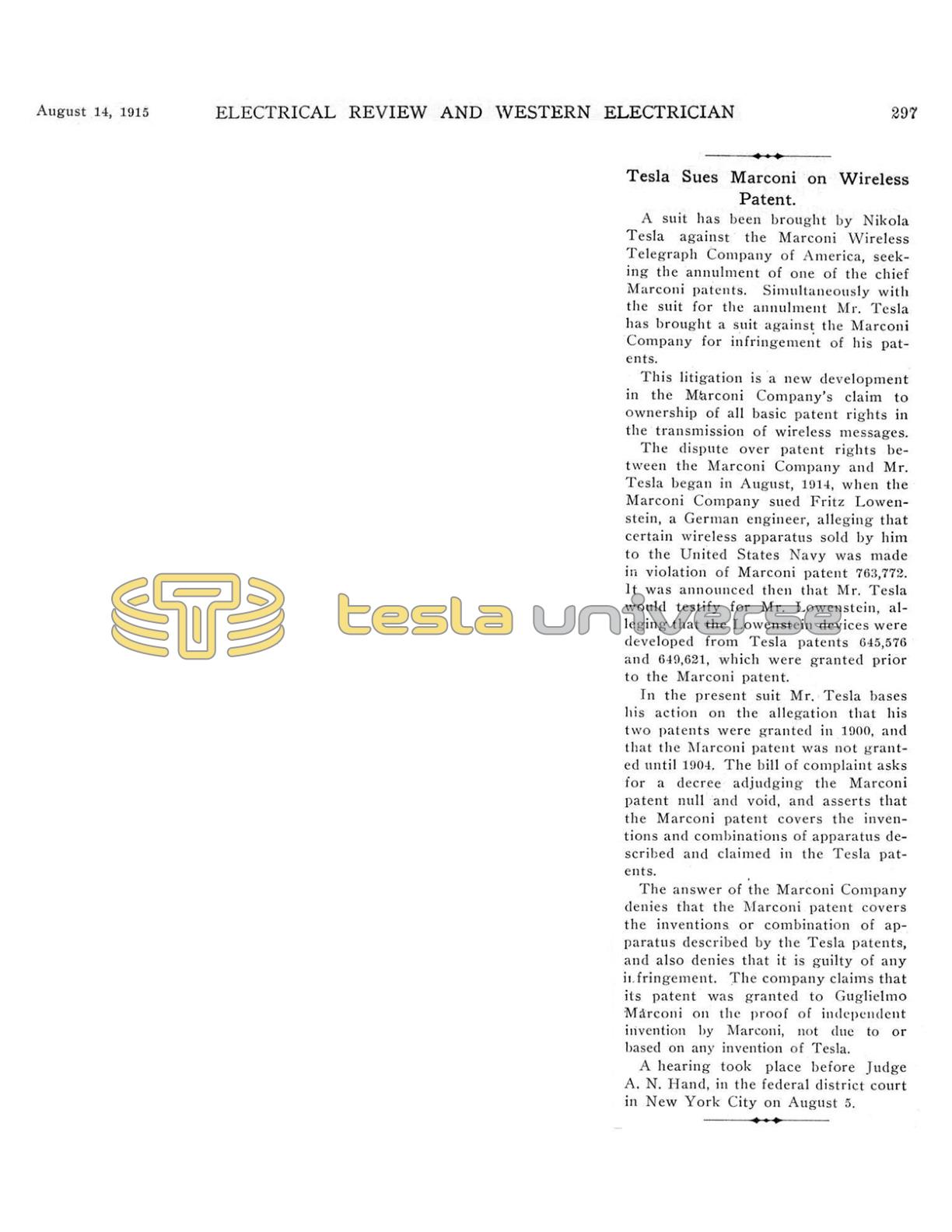 The dispute over patent rights between the Marconi Company and Mr. Tesla began in August, 1914, when the Marconi Company sued Fritz Lowenstein, a German engineer, alleging that certain wireless apparatus sold by him. to the United States Navy was made in violation of Marconi patent 763,772. It was announced then that Mr. Tesla would testify for Mr. Lowenstein, alleging that the Lowenstein devices were developed from Tesla patents 645,576 and 649,621, which were granted prior to the Marconi patent.
