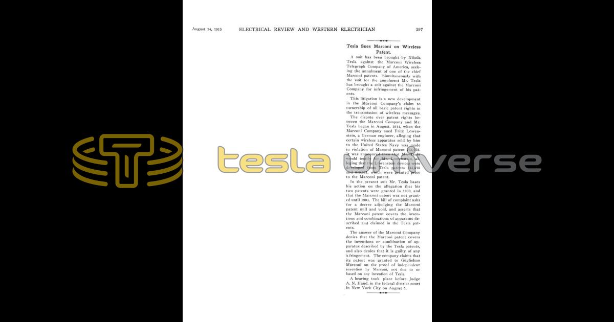 A suit has been brought by Nikola Tesla against the Marconi Wireless Telegraph Company of America, seeking the annulment of one of the chief Marconi patents. Simultaneously with the suit for the annulment Mr. Tesla has brought a suit against the Marconi Company for infringement of his patents.
