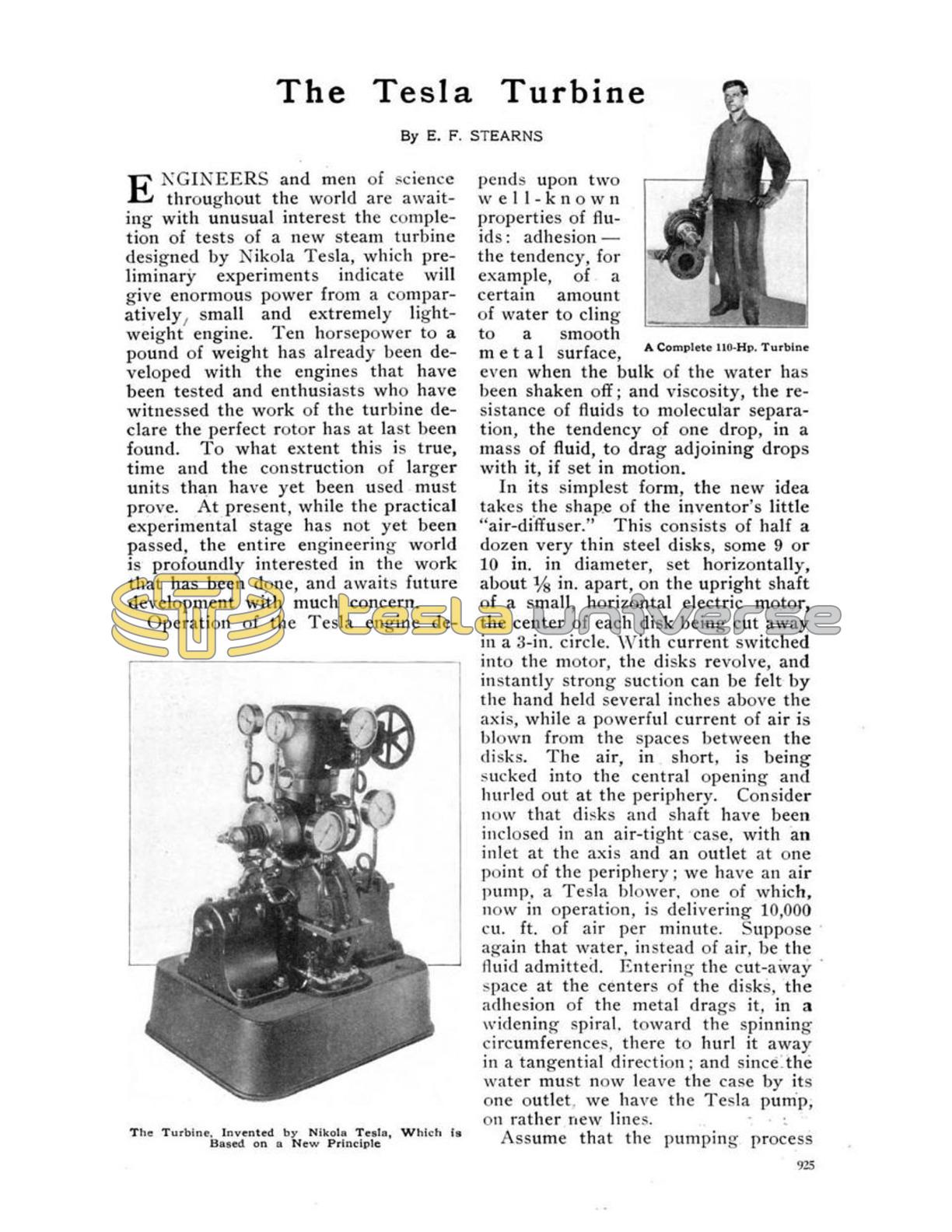 Engineers and men of science throughout the world are awaiting with unusual interest the completion of tests of a new steam turbine designed by Nikola Tesla, which preliminary experiments indicate will give enormous power from a comparatively small and extremely lightweight engine. Ten horsepower to a pound of weight has already been developed with the engines that have been tested and enthusiasts who have witnessed the work of the turbine declare the perfect rotor has at last been found. To what extent this is true, time and the construction of larger units than have yet been used must prove. At present, while the practical experimental stage has not yet been passed, the entire engineering world is profoundly interested in the work that has been done, and awaits future development with much concern.