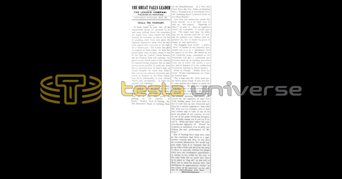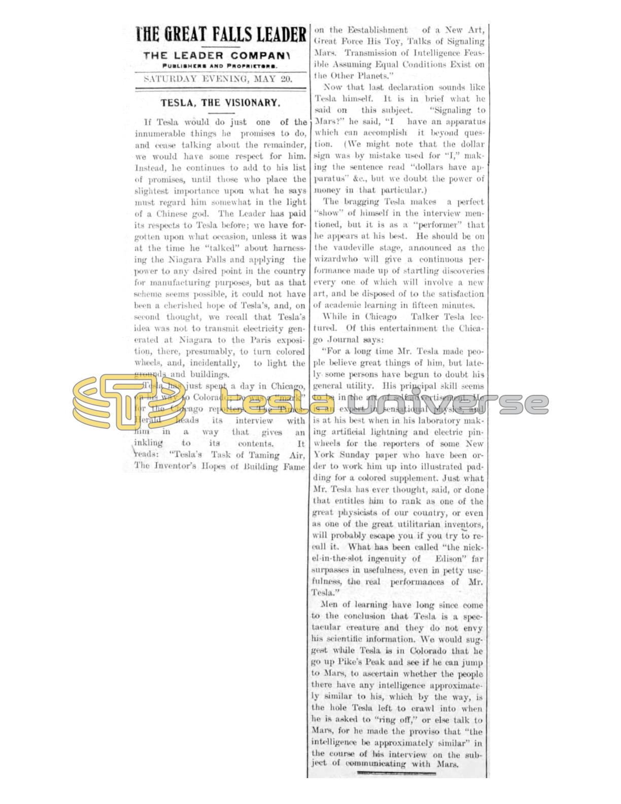 Men of learning have long since come to the conclusion that Tesla is a spectacular creature and they do not envy his scientific information. We would suggest while Tesla is in Colorado that he go up Pike's Peak and see if he can jump to Mars, to ascertain whether the people there have any intelligence approximately similar to his, which by the way, is the hole Tesla left to crawl into when he is asked to "ring off," or else talk to Mars, for he made the proviso that "the intelligence be approximately similar" in the course of his interview on the subject of communicating with Mars.