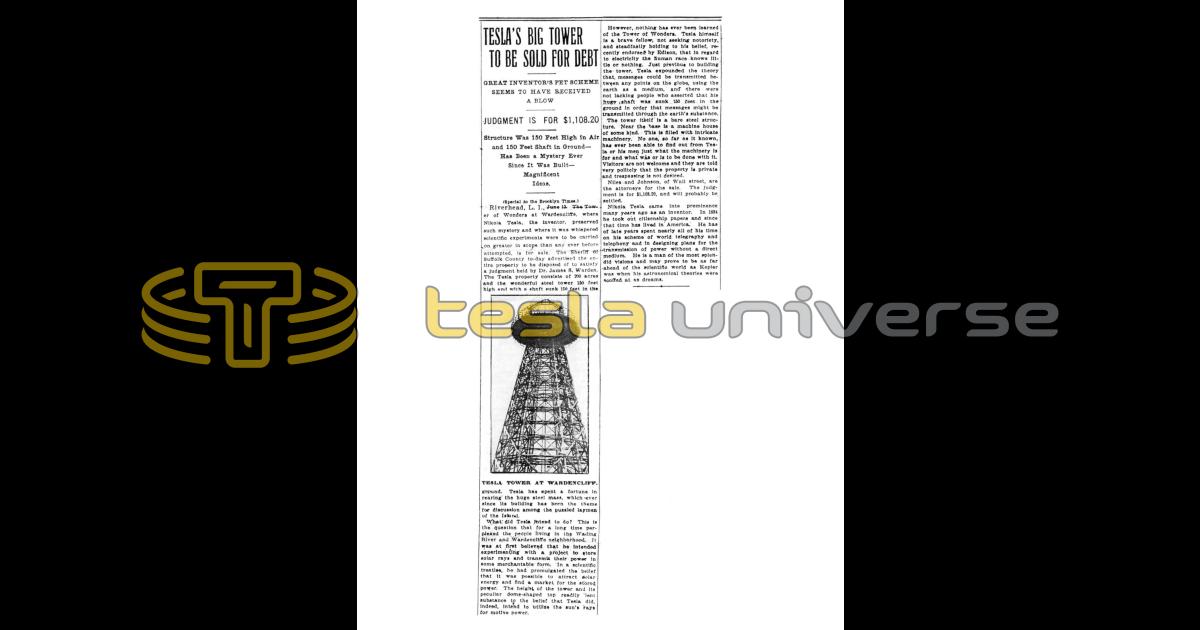 Riverhead, L. I., June 12. The Tower of Wonders at Wardenclyffe, where Nikola Tesla, the inventor, preserved such mystery and where it was whispered scientific experiments were to be carried on greater in scope than any ever before attempted, is for sale. The Sheriff of Suffolk County to-day advertised the en- tire property to be disposed of to satisfy a judgment held by Dr. James S. Warden. The Tesla property consists of 200 acres and the wonderful steel tower 150 feet high and with a shaft sunk 150 feet in the ground. Tesla has spent a fortune in rearing the huge steel mass, which ever since its building has been the theme for discussion among the puzzled laymen of the Island.