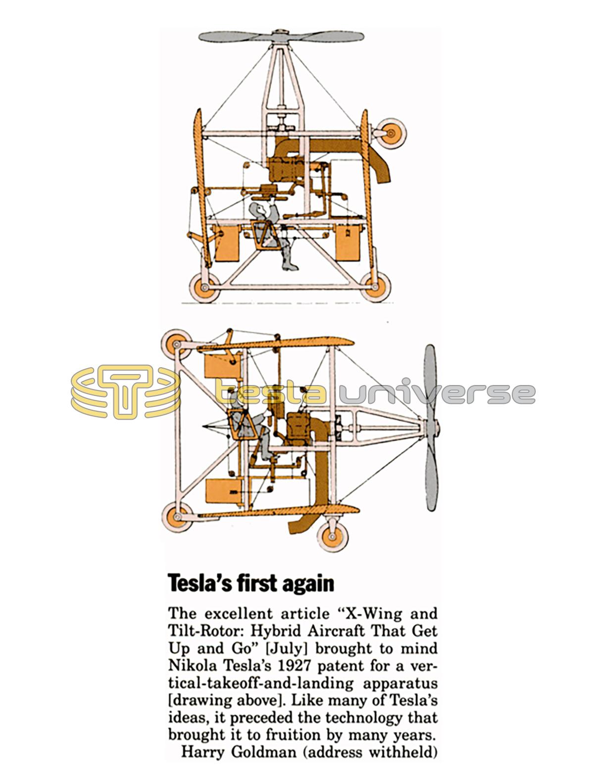 The excellent article "X-Wing and We make a conscious effort to provide Tilt-Rotor: Hybrid Aircraft That Get accurate prices and addresses of Up and Go" [July] brought to mind sources where appropriate. There's a Nikola Tesla's 1927 patent for a a vertical-takeoff-and-landing apparatus [drawing above]. Like many of Tesla's ideas, it preceded the technology that brought it to fruition by many years.