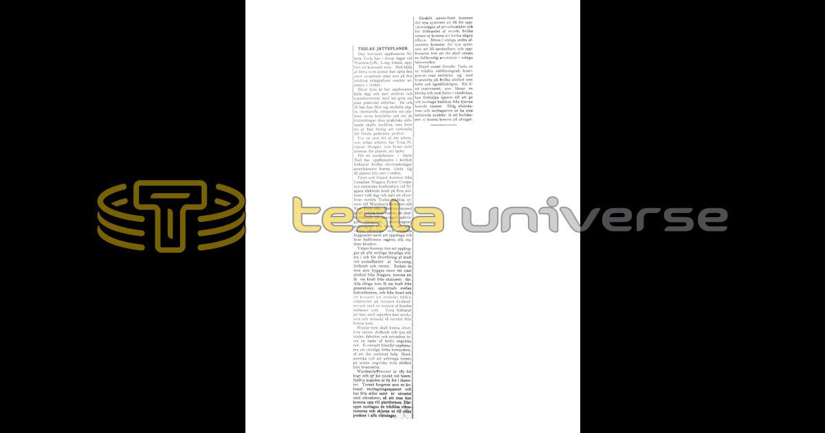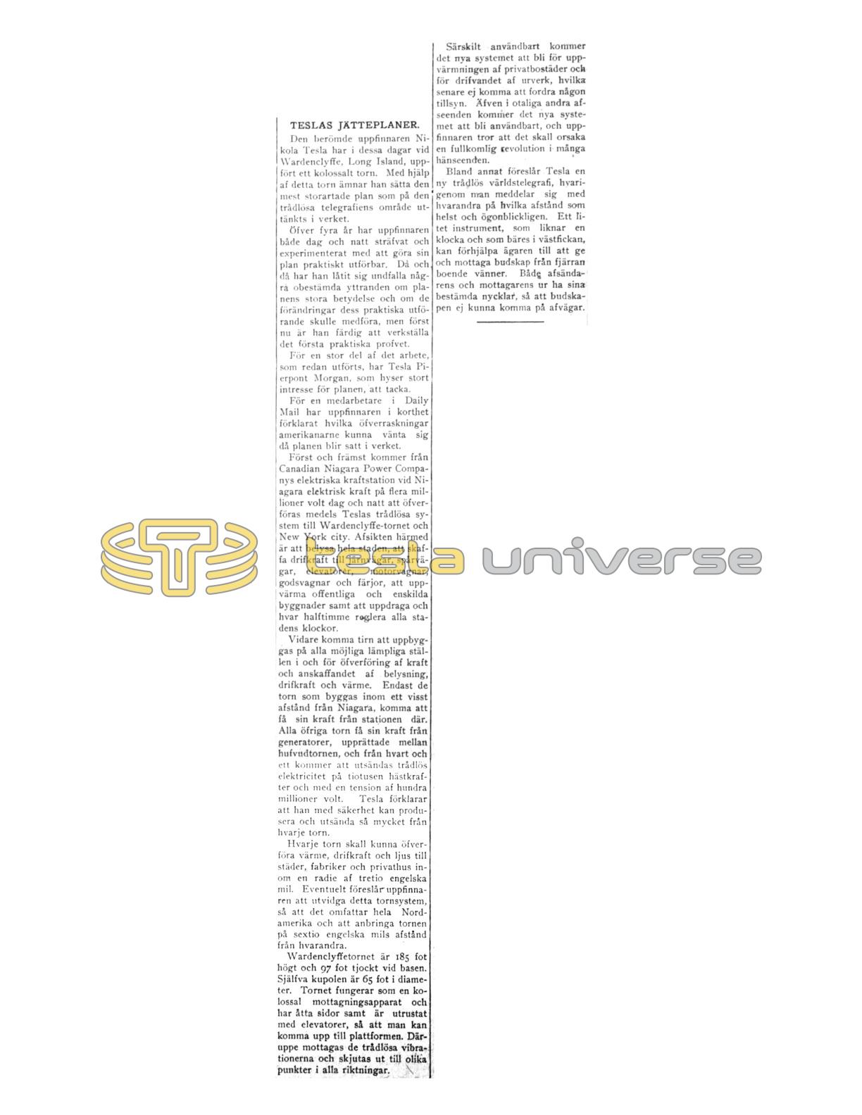 First and foremost electric power of several million volts from the Canadian Niagara Power Company's electric power station at Niagara will day and night be transmitted by means of Tesla's wireless system to the Wardenclyffe tower and New York city. The intention with this is to illuminate the entire city, to provide motive power for railways, streetcars, elevators, motor cars, freight cars and ferries, to heat public and private buildings as well as to wind up and every half hour strike all the city's clocks.