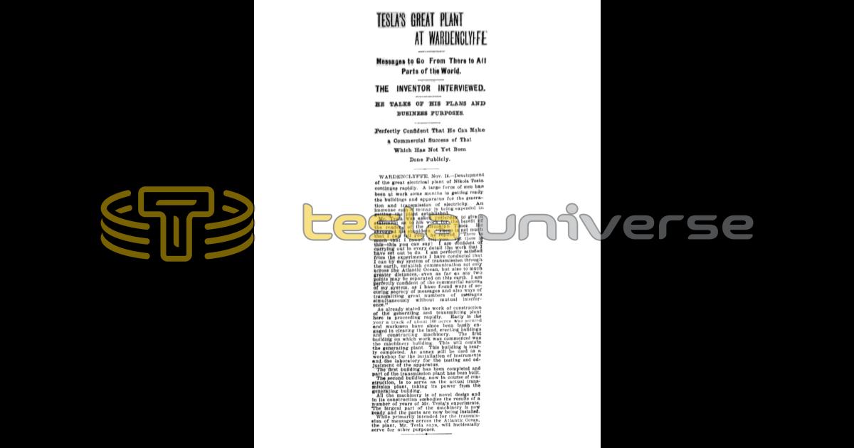 WARDENCLYFFE, Nov. 14. — Development of the great electrical plant of Nikola Tesla continues rapidly. A large force of men has been at work some months in getting ready the buildings and apparatus for the generation and transmission of electricity. An immense sum of money is being expended in getting the plant established.