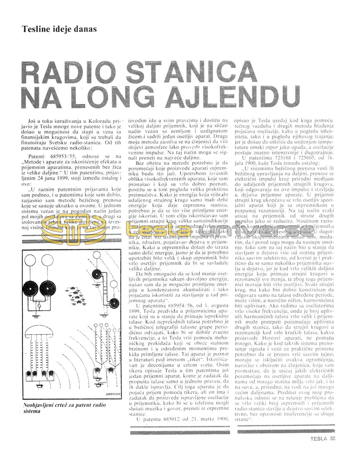 In the patents 685954/56 of 1 August 1899 Tesla foresees in the receivers apparatuses which stand in a position to receive interrupted waves. For continuous waves it is necessary in wireless telegraphy to periodically separate the wave groups in order to obtain audible frequencies and Tesla does this with the help of a mechanical breaker which rotates at constant speed and at determined moments interrupts the received waves. That apparatus is known in the literature under the name "ticker". It has been utilized for decades in the whole world. Besides the ticker Tesla describes in these patents yet another receiving apparatus whose task is to let the waves pass only in one direction thus to rectify them. The goal of that apparatus is to amplify the reception with the help of the ticker but it also has the task to produce rectified oscillations in the receiver so that music and speech transmitted from the transmitting station could be listened to in the telephone.