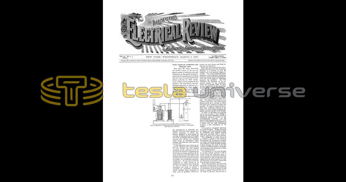 Ever since Mr. Tesla discovered the hurtful action of the air and gaseous matter in induction coils and condensers, he has applied himself to perfecting his apparatus and methods with the view of overcoming the fatal defects produced by these causes. As an evidence of his progress in this direction, the Electrical Review publishes here with an abstract of a patent granted to Mr. Tesla on February 23, 1897, which was filed in the United States Patent Office on November 5, 1896. In his specification Mr. Tesla says: