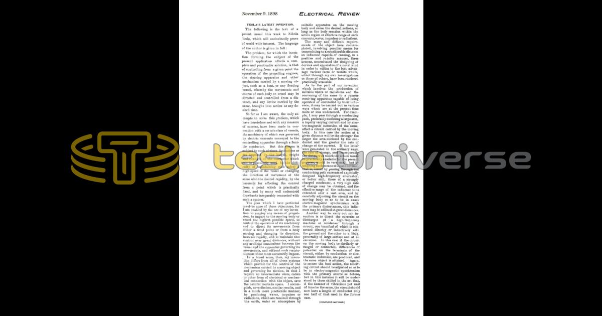 The following is the text of a patent issued this week to Nikola Tesla, which will undoubtedly prove of world wide interest. The language of the author is given in full:
