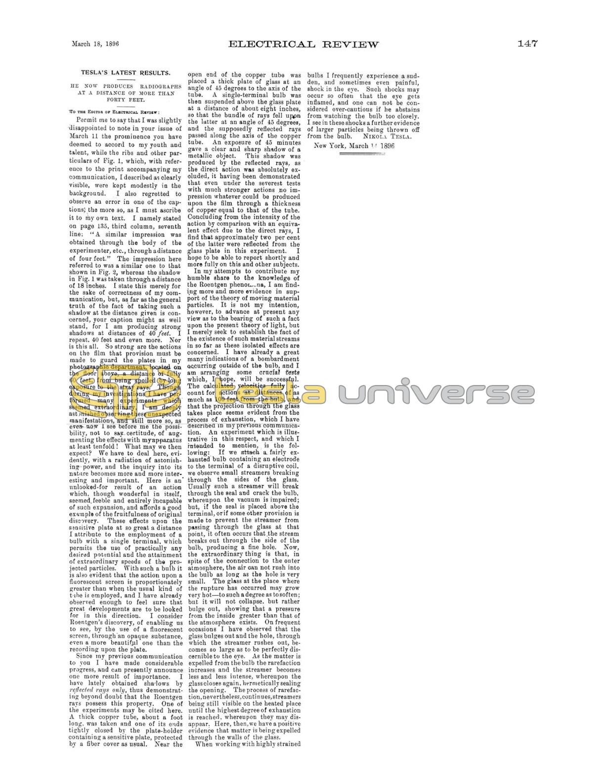 Permit me to say that I was slightly disappointed to note in your issue of March 11 the prominence you have deemed to accord to my youth and talent, while the ribs and other particulars of Fig. 1, which, with reference to the print accompanying my communication, I described as clearly visible, were kept modestly in the background. I also regretted to observe an error in one of the captions, the more so, as I must ascribe it to my own text. I namely stated on page 135, third column, seventh line: “A similar impression was obtained through the body of the experimenter, etc., through a distance of four feet.” The impression here referred to was a similar one to that shown in Fig. 2, whereas the shadow in Fig. 1 was taken through a distance of 18 inches. I state this merely for the sake of correctness of my communication, but, as far as the general truth of the fact of taking such a shadow at the distance given is concerned, your caption might as well stand, for I am producing strong shadows at distances of 40 feet. I repeat, 40 feet and even more. Nor is this all. So strong are the actions on the film that provisions must be made to guard the plates in my photographic department, located on the floor above, a distance of fully 60 feet, from being spoiled by long exposure to the stray rays. Though during my investigations I have performed many experiments which seemed extraordinary, I am deeply astonished observing these unexpected manifestations, and still more so, as even now I see before me the possibility, not to say certitude, of augmenting the effects with my apparatus at least tenfold! What may we then expect? We have to deal here, evidently, with a radiation of astonishing power, and the inquiry into its nature becomes more and more interesting and important. Here is an unlooked-for result of an action which, though wonderful in itself, seemed feeble and entirely incapable of such expansion, and affords a good example of the fruitfulness of original discovery. These effects upon the sensitive plate at so great a distance I attribute to the employment of a bulb with a single terminal, which permits the use of practically any desired potential and the attainment of extraordinary speeds of the projected particles. With such a bulb it is also evident that the action upon a fluorescent screen is proportionately greater than when the usual kind of tube is employed, and I have already observed enough to feel sure that great developments are to be looked for in this direction. I consider Roentgen’s discovery, of enabling us to see, by the use of a fluorescent screen, through an opaque substance, even a more beautiful one than the recording upon the plate.