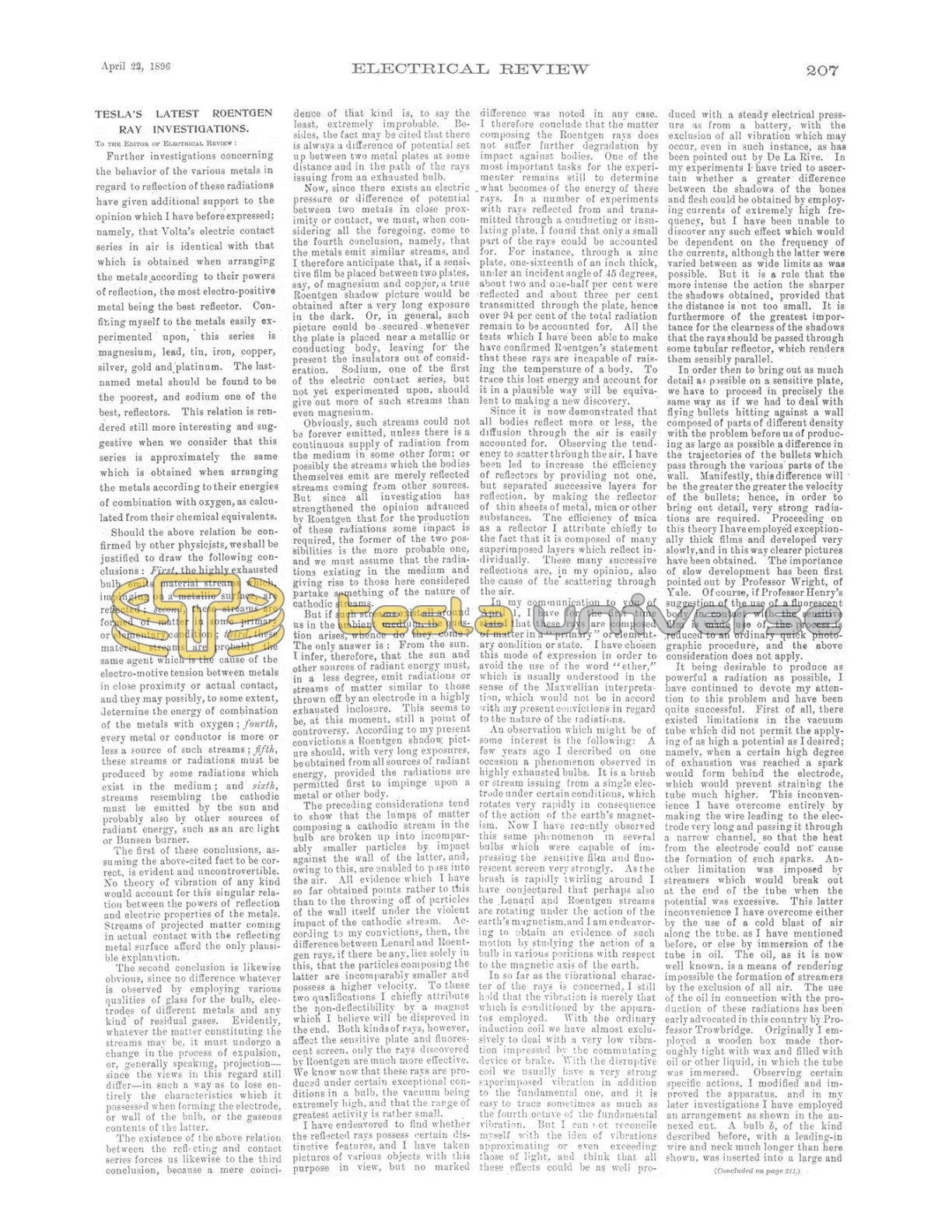 An observation which might be of some interest is the following: A few years ago I described on one occasion a phenomenon observed in highly exhausted bulbs. It is a brush or stream issuing from a single electrode under certain conditions, which rotates very rapidly in consequence of the action of the earth’s magnetism. Now I have recently observed this same phenomenon in several bulbs which were capable of impressing the sensitive film and fluorescent screen very strongly. As the brush is rapidly twirling around I have conjectured that perhaps also the Lenard and Roentgen streams are rotating under the action of the earth’s magnetism, and I am endeavoring to obtain an evidence of such motion by studying the action of a bulb in various positions with respect to the magnetic axis of the earth.