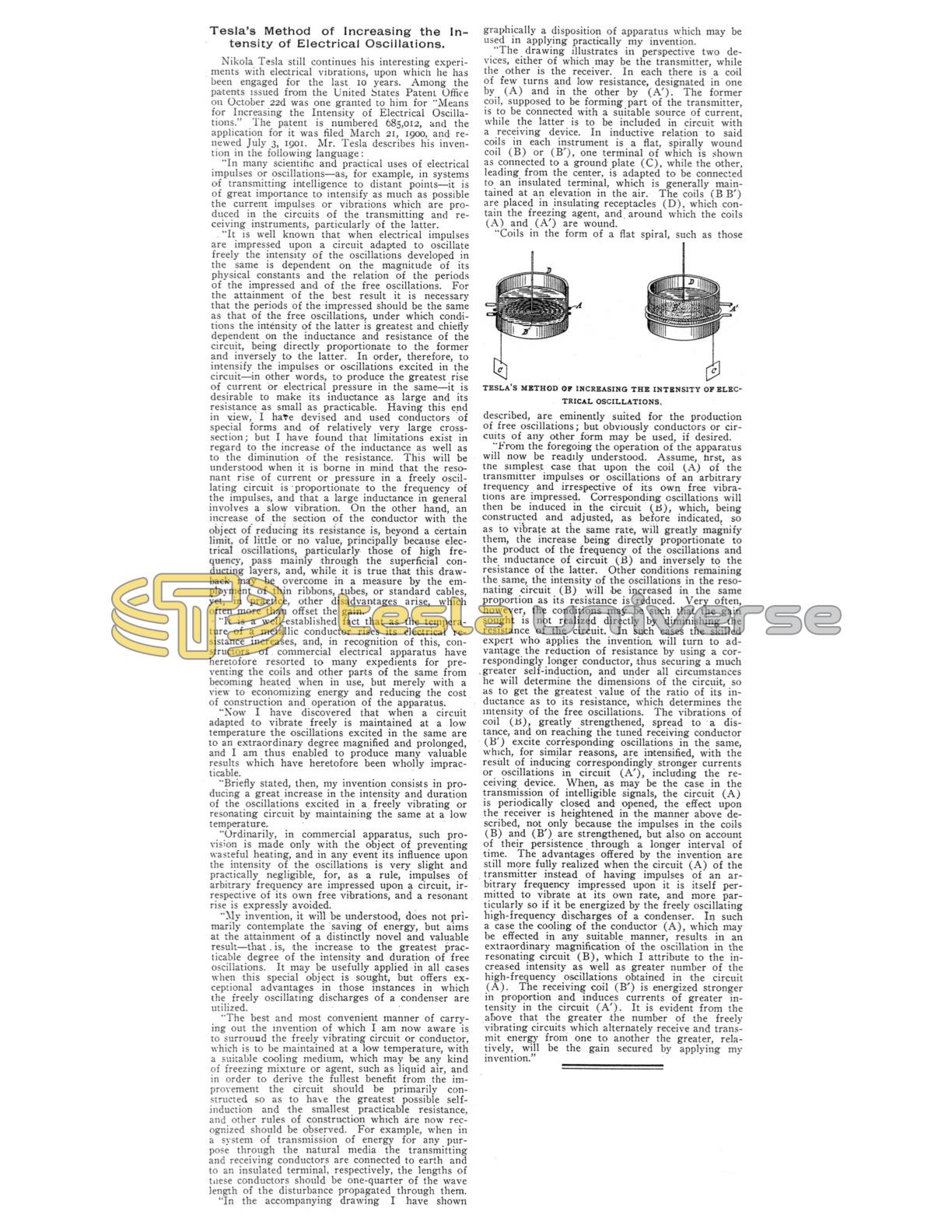 Nikola Tesla still continues his interesting experiments with electrical vibrations, upon which he has been engaged for the last 10 years. Among the patents issued from the United States Patent Office on October 22d was one granted to him for "Means for Increasing the Intensity of Electrical Oscillations." The patent is numbered 685,012, and the application for it was filed March 21, 1900, and renewed July 3, 1901. Mr. Tesla describes his invention in the following language: