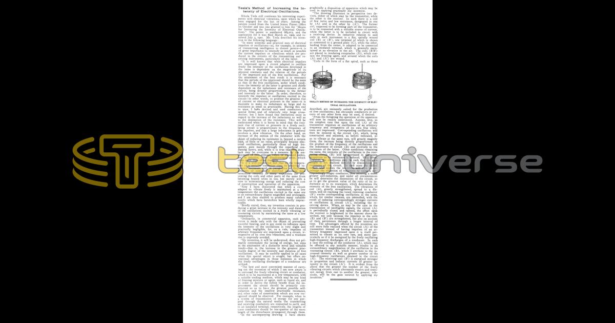 "In many scientific and practical uses of electrical impulses or oscillations—as, for example, in systems of transmitting intelligence to distant points — it is of great importance to intensify as much as possible the current impulses or vibrations which are produced in the circuits of the transmitting and receiving instruments, particularly of the latter.