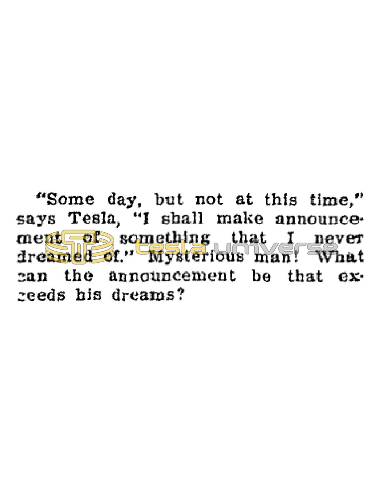 “Some day, but not at this time,” says Tesla, “I shall make announcement of something that I never dreamed of.” Mysterious man! What can the announcement be that exceeds his dreams?