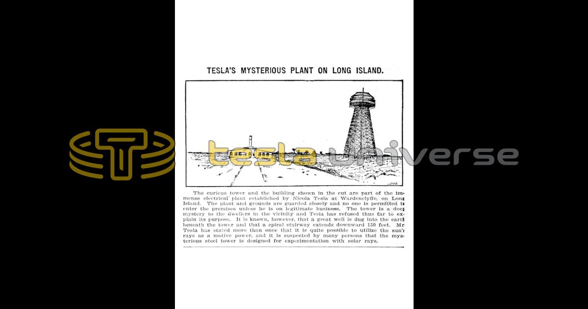 The curious tower and the building shown in the cut are part of the immense electrical plant established by Nikola Tesla at Wardenclyffe, on Long Island. The plant and grounds are guarded closely and no one is permitted to enter the premises unless he is on legitimate business. The tower is a deep mystery to the dwellers in the vicinity and Tesla has refused thus far to explain its purpose. It is known, however, that a great well is dug into the earth beneath the tower and that a spiral stairway extends downward 150 feet. Mr Tesla has stated more than once that it is quite possible to utilize the sun's rays as a motive power, and it is suspected by many persons that the mysterious steel tower is designed for experimentation with solar rays.