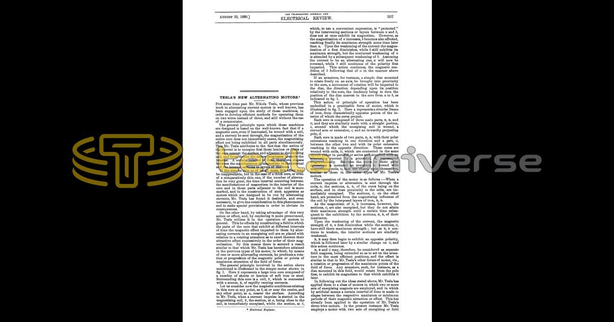 Nikola Tesla Articles Newspaper and magazine articles related to Nikola Tesla Tesla's New Alternating Motors (reprint) Electrical Review August 22nd, 1890 Page number(s): 207-209 This article is a reprint from Electrical Engineer of August 6, 1890 and is intentionally not duplicated here. Downloads Downloads for this article are available to members.Log in or join today to access all content. Downloads Downloads for this article are available to members.Log in or join today to access all content. Pagination Enjoy other articles First First item Previous Previous item Next Next item Last Last item Within the Universe Timeline Important moments and events related to Tesla. Articles Nikola Tesla in the press. Books Books written by and about Nikola Tesla. Documents Nikola Tesla documents, files and papers. Quotes Profound and insightful quotes by Nikola Tesla. Movies and TV Nikola Tesla on the screen. Patents Nikola Tesla held around 200 patents worldwide. Landmarks Locations related to Nikola Tesla. Images Nikola Tesla image and photo library. Show more Pagination Enjoy other articles First First item Previous Previous item Next Next item Last Last item Within the Universe Documents Nikola Tesla documents, files and papers. Quotes Profound and insightful quotes by Nikola Tesla. Books Books written by and about Nikola Tesla. Timeline Important moments and events related to Tesla. Patents Nikola Tesla held around 200 patents worldwide. Images Nikola Tesla image and photo library. Landmarks Locations related to Nikola Tesla. Letters Letters to, from and about Nikola Tesla. Movies and TV Nikola Tesla on the screen.