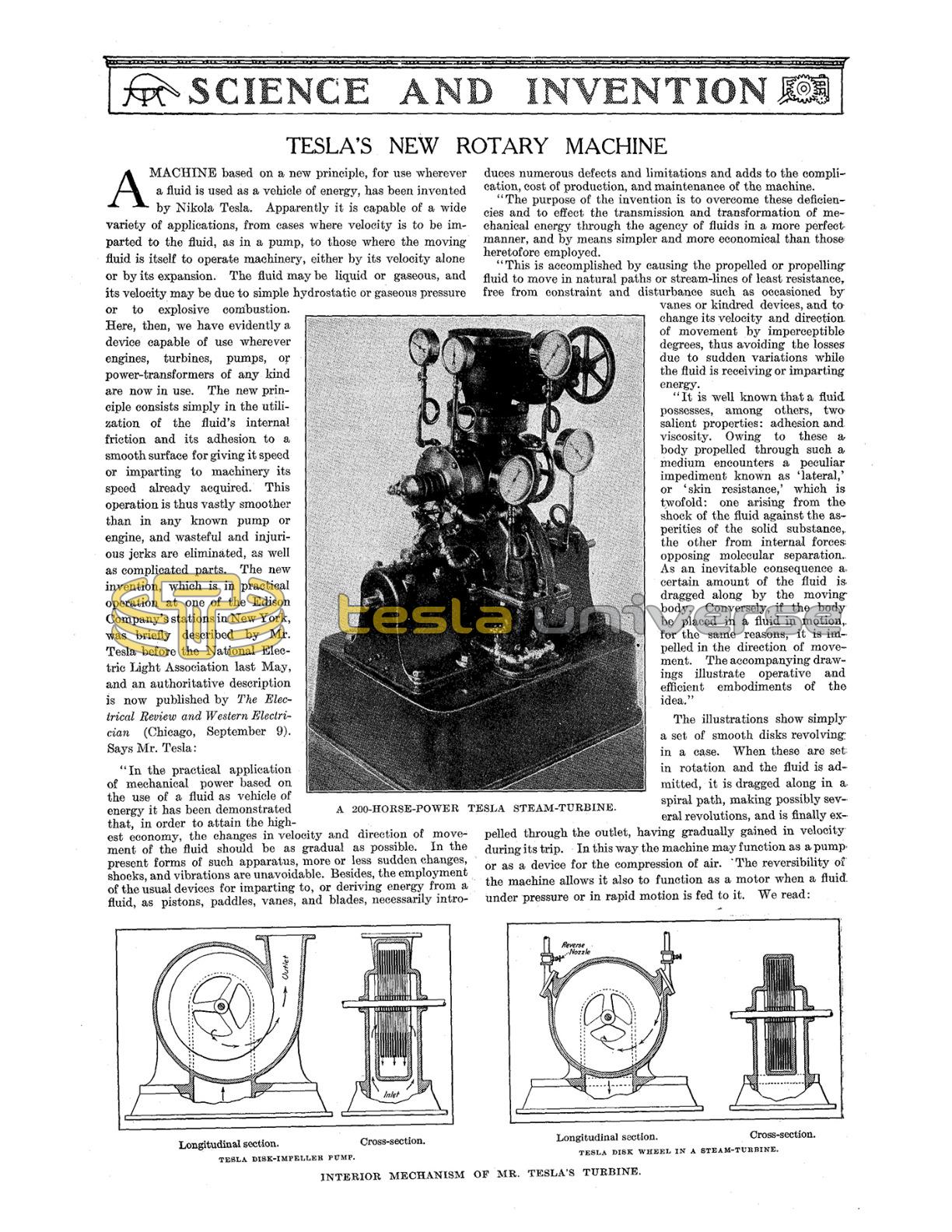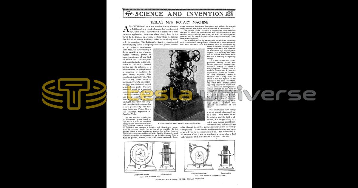 A machine based on a new principle, for use wherever a fluid is used as a vehicle of energy, has been invented by Nikola Tesla. Apparently it is capable of a wide variety of applications, from cases where velocity is to be imparted to the fluid, as in a pump, to those where the moving fluid is itself to operate machinery, either by its velocity alone or by its expansion. The fluid may be liquid or gaseous, and its velocity may be due to simple hydrostatic or gaseous pressure or to explosive combustion. Here, then, we have evidently a device capable of use wherever engines, turbines, pumps, or power-transformers of any kind are now in use. The new principle consists simply in the utilization of the fluid’s internal friction and its adhesion to a smooth surface for giving it speed or imparting to machinery its speed already acquired. This operation is thus vastly smoother than in any known pump or engine, and wasteful and injurious jerks are eliminated, as well as complicated parts. The new invention, which is in practical operation at one of the Edison Company’s stations in New York, was briefly described by Mr. Tesla before the National Electric Light Association last May, and an authoritative description is now published by The Electrical Review and Western Electrician (Chicago, September 9). Says Mr. Tesla: