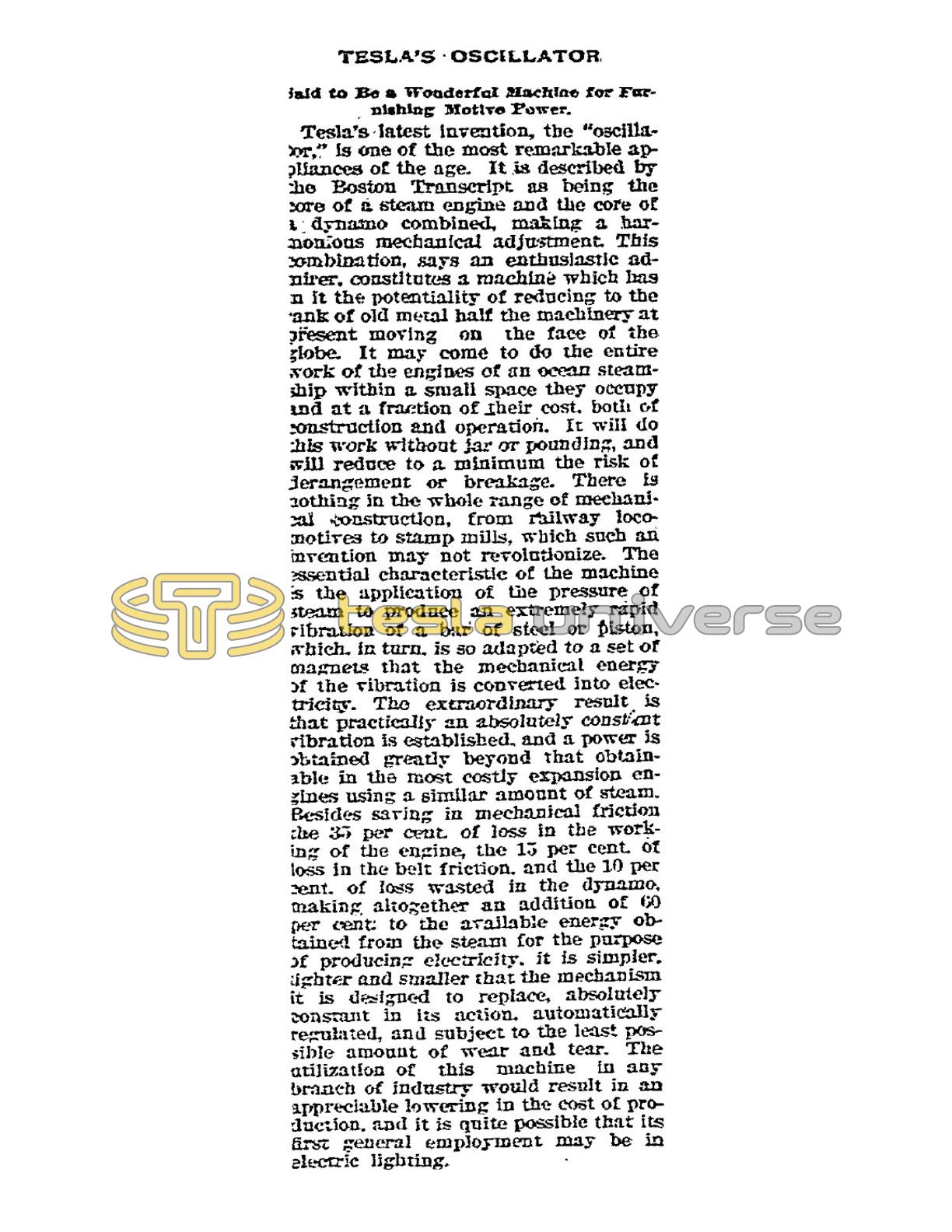 Tesla’s latest invention, the “oscillator,” is one of the most remarkable appliances of the age. It is described by the Boston Transcript as being the core of a steam engine and the core of a dynamo combined, making a harmonious mechanical adjustment. This combination, says an enthusiastic admirer, constitutes a machine which has in it the potentiality of reducing to the rank of old metal half the machinery at present moving on the face of the globe. It may come to do the entire work of the engines of an ocean steamship within a small space they occupy and at a fraction of their cost, both of construction and operation. It will do this work without jar or pounding, and will reduce to a minimum the risk of derangement or breakage. There is nothing in the whole range of mechanical construction, from railway locomotives to stamp mills, which such an invention may not revolutionize. The essential characteristic of the machine is the application of the pressure of steam to produce an extremely rapid vibration of a bar of steel or piston, which, in turn, is so adapted to a set of magnets that the mechanical energy of the vibration is converted into electricity. The extraordinary result is that practically an absolutely consistent vibration is established, and a power is obtained greatly beyond that obtainable in the most costly expansion engines using a similar amount of steam.