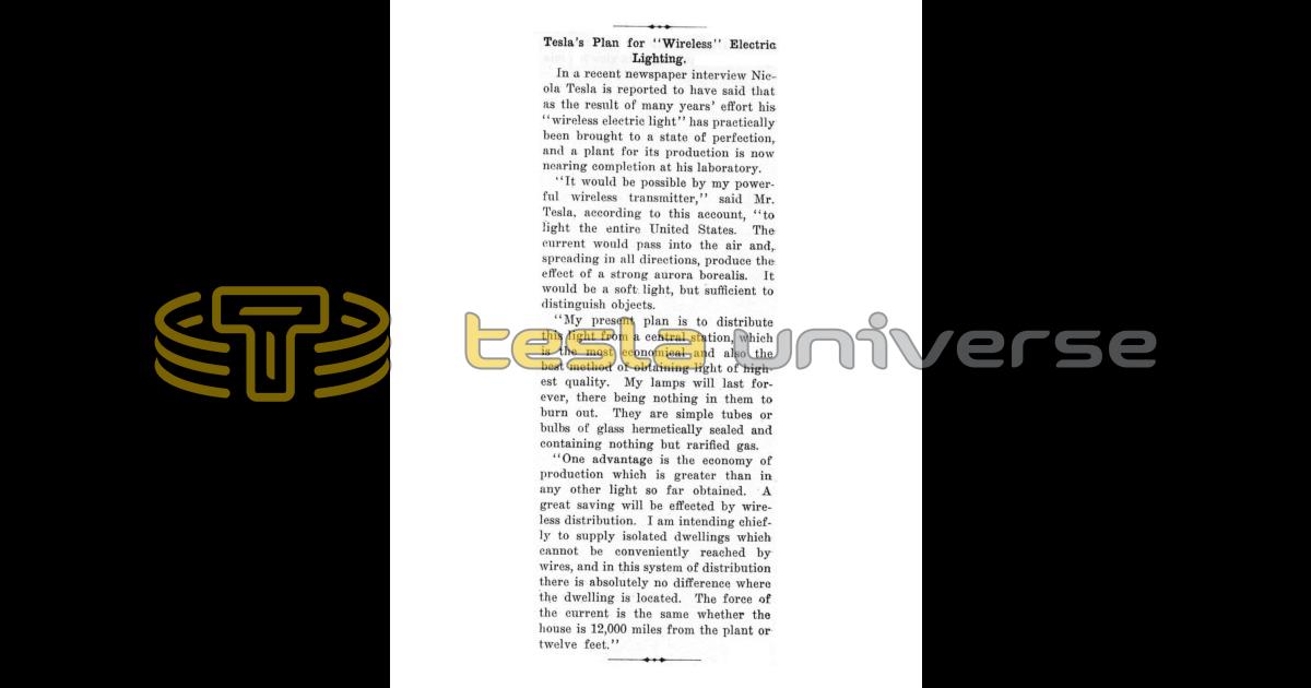 "It would be possible by my powerful wireless transmitter," said Mr. Tesla, according to this account, "to light the entire United States. The current would pass into the air and, spreading in all directions, produce the effect of a strong aurora borealis. It would be a soft light, but sufficient to distinguish objects.