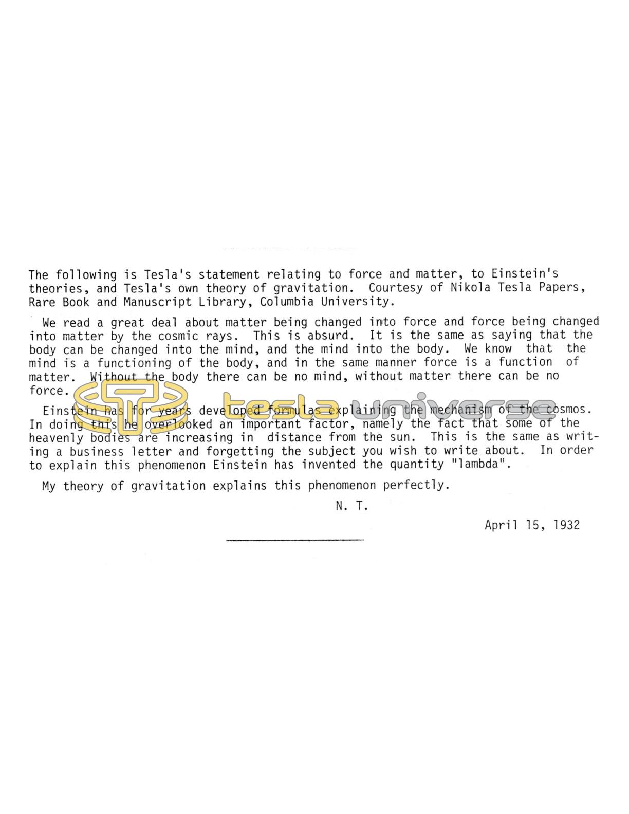 The following is Tesla's statement relating to force and matter, to Einstein's theories, and Tesla's own theory of gravitation. Courtesy of Nikola Tesla Papers, Rare Book and Manuscript Library, Columbia University.