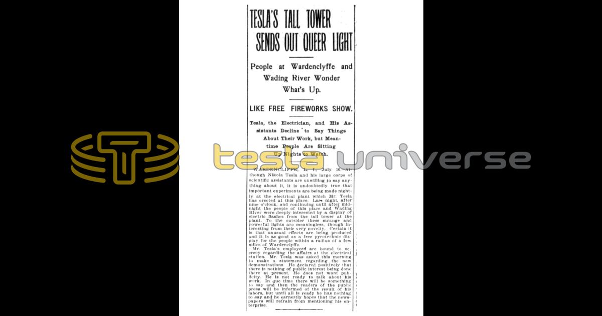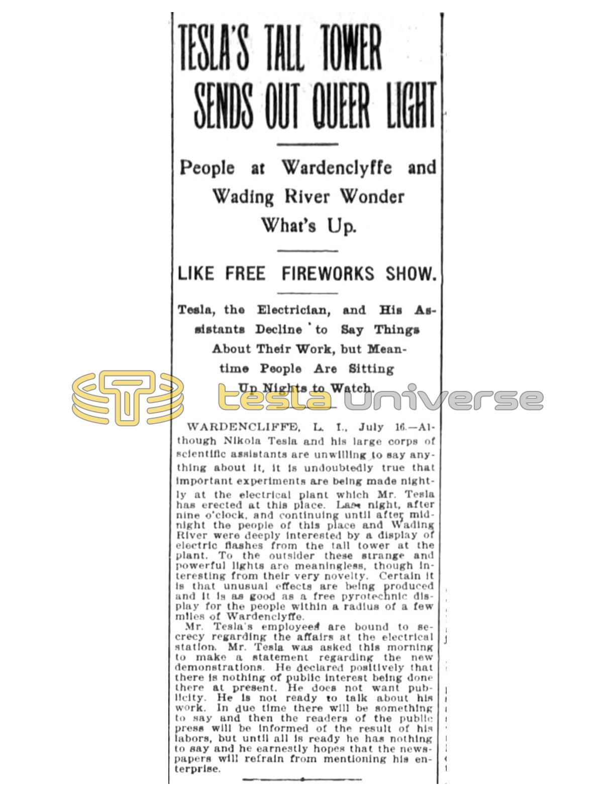 WARDENCLIFFE, L. I., July 16. — Although Nikola Tesla and his large corps of scientific assistants are unwilling to say anything about it, it is undoubtedly true that Important experiments are being made nightly at the electrical plant which Mr. Tesla has erected at this place. Las night, after nine o'clock, and continuing until after midnight the people of this place and Wading River were deeply interested by a display of electric flashes from the tall tower at the plant. To the outsider these strange and powerful lights are meaningless, though interesting from their very novelty. Certain it is that unusual effects are being produced and it is as good as a free pyrotechnic display for the people within a radius of a few miles of Wardenclyffe.