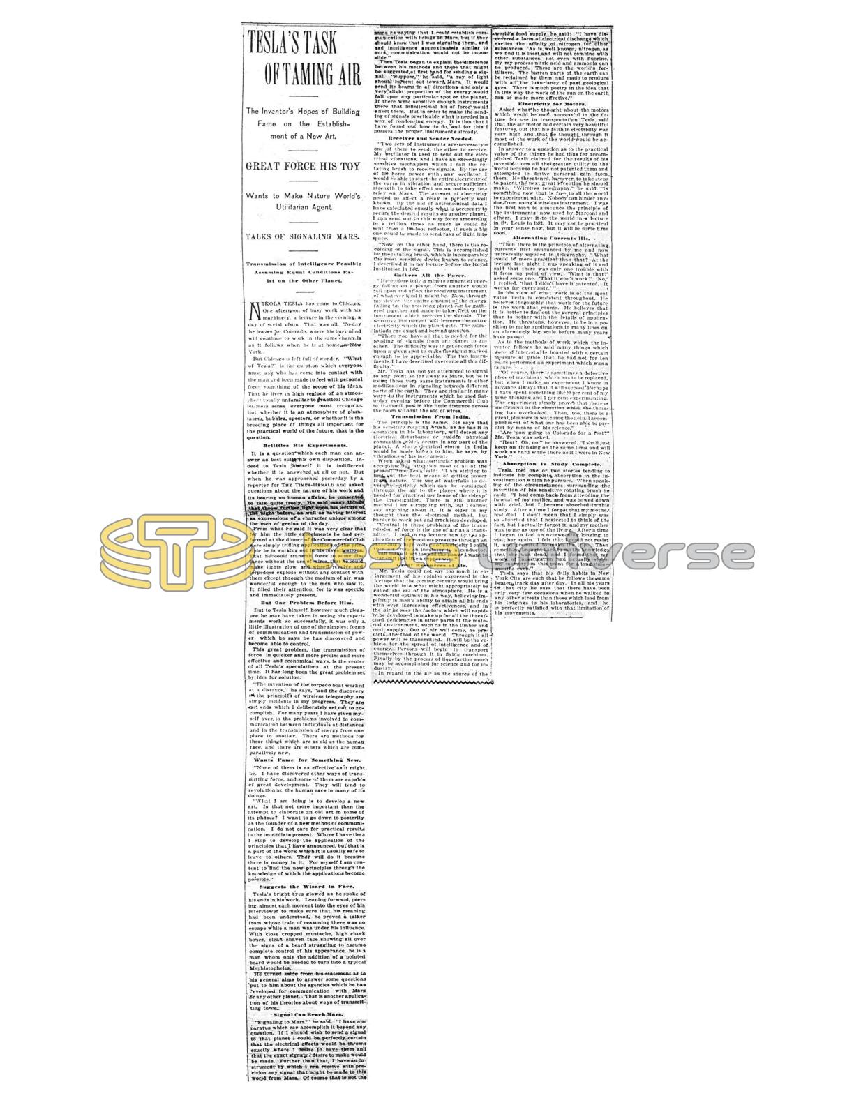 Mr. Tesla has not yet attempted to signal to any point so far away as Mars, but he is using these very same instruments in other modifications in signaling between different parts of the earth. They are similar in many ways to the instruments which he used Saturday evening before the Commercial Club to transmit power the little distance across the room without the aid of wires.