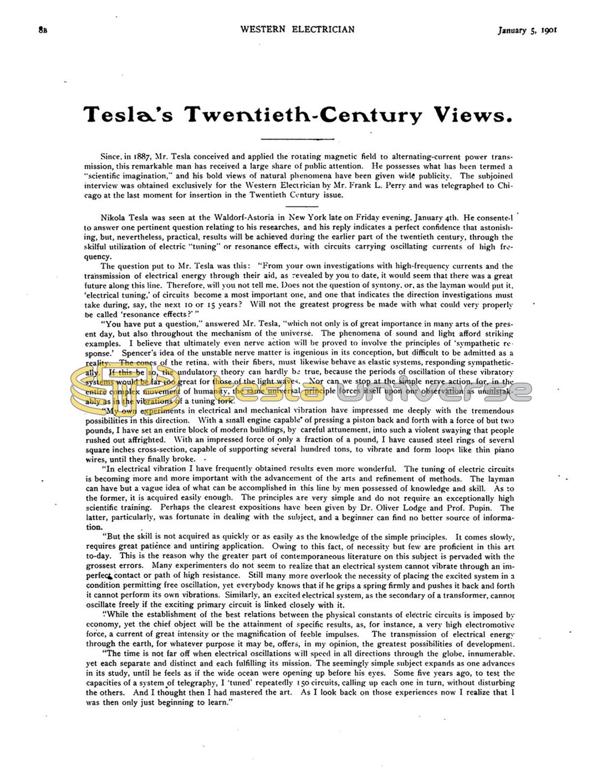 Nikola Tesla was seen at the Waldorf-Astoria in New York late on Friday evening, January 4th. He consented to answer one pertinent question relating to his researches, and his reply indicates a perfect confidence that astonishing, but, nevertheless, practical, results will be achieved during the earlier part of the twentieth century, through the skillful utilization of electric “tuning” or resonance effects, with circuits carrying oscillating currents of high frequency.