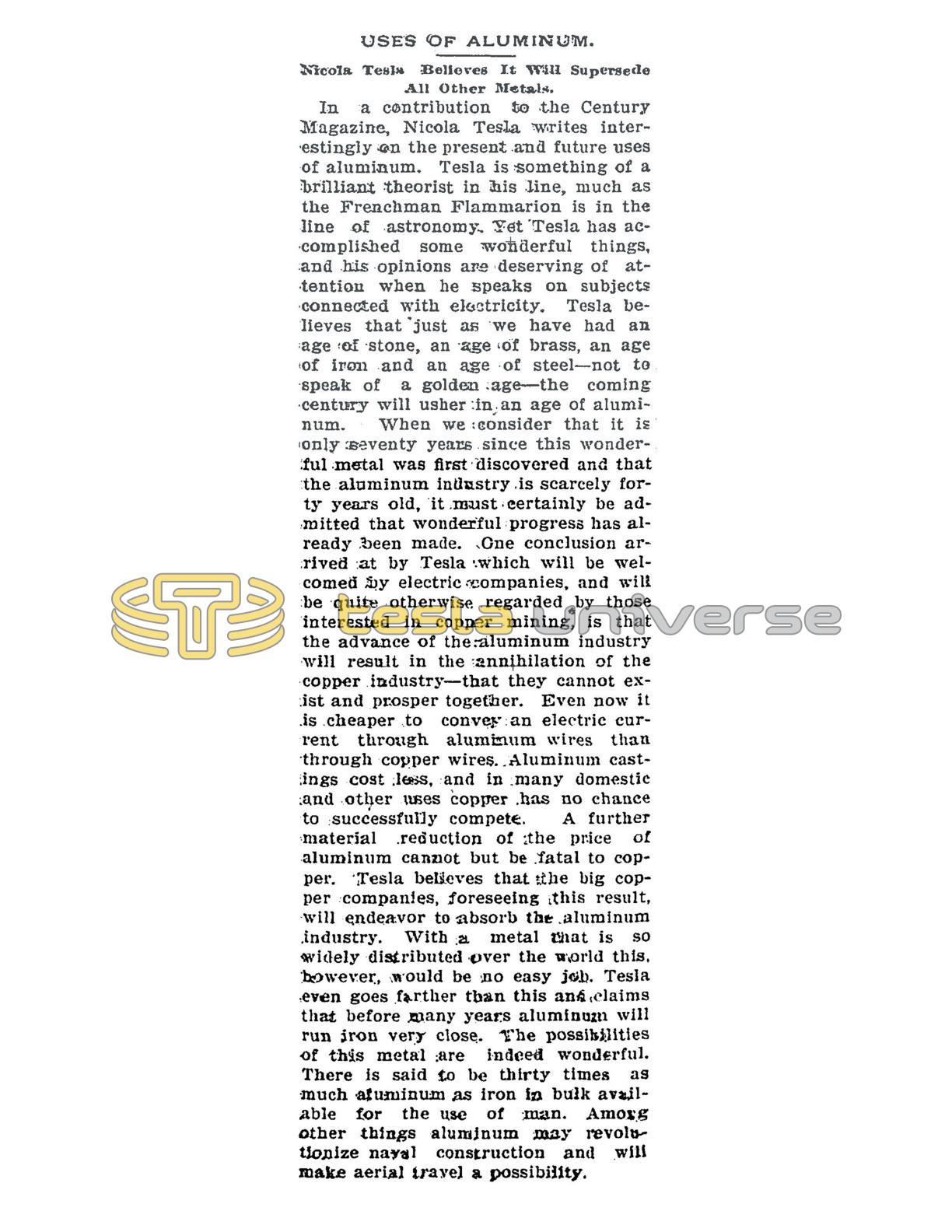 In a contribution to the Century Magazine, Nicola [sic] Tesla writes interestingly on the present and future uses of aluminum. Tesla is something of a brilliant theorist in his line, much as the Frenchman Flammarion is in the line of astronomy. Yet Tesla has accomplished some wonderful things, and his opinions are deserving of attention when he speaks on subjects connected with electricity.