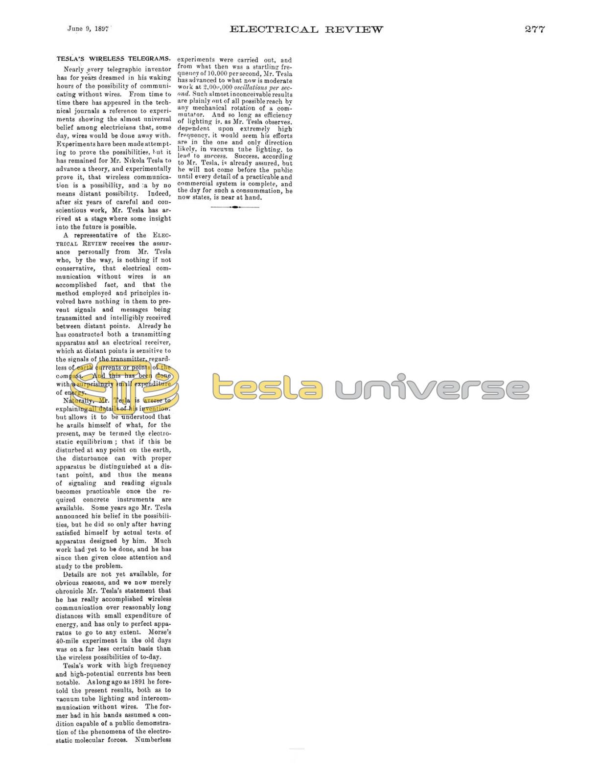 A representative of the Electrical Review receives the assurance personally from Mr. Tesla who, by the way, is nothing if not conservative, that electrical communication without wires is an accomplished fact, and that the method employed and principles involved have nothing in them to prevent signals and messages being transmitted and intelligibly received between distant points. Already he has constructed both a transmitting apparatus and an electrical receiver, which at distant points is sensitive to the signals of the transmitter, regardless of earth currents or points of the compass. And this has been done with a surprisingly small expenditure of energy.
