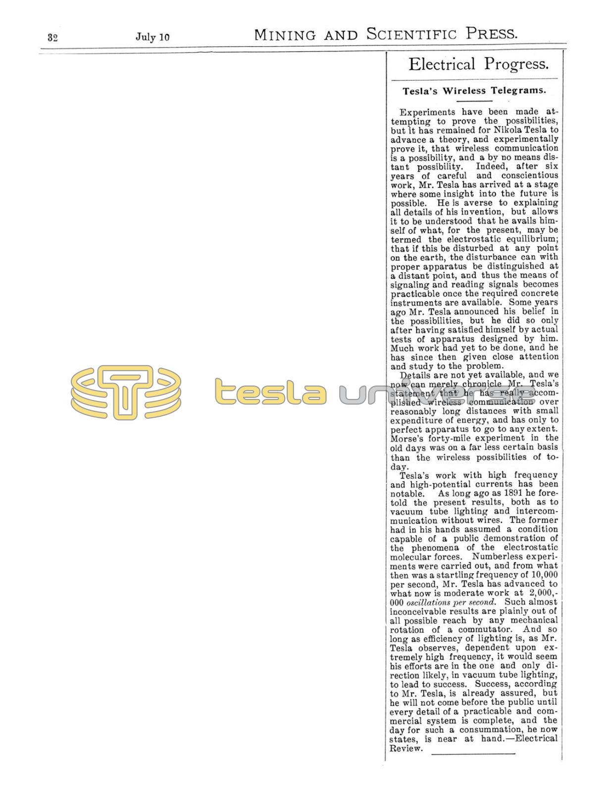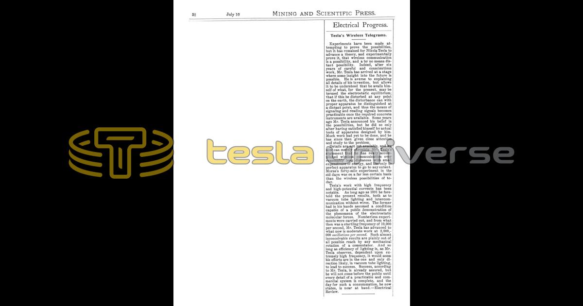 Nikola Tesla Articles Newspaper and magazine articles related to Nikola Tesla Tesla's Wireless Telegrams (Reprint) Mining and Scientific Press July 10th, 1897 Page number(s): 32 This article is a reprint from the Electrical Review of June 9th, 1897 and is intentionally not duplicated here. Downloads Downloads for this article are available to members.Log in or join today to access all content. Downloads Downloads for this article are available to members.Log in or join today to access all content. Pagination Enjoy other articles First First item Previous Previous item Next Next item Last Last item Within the Universe Timeline Important moments and events related to Tesla. Articles Nikola Tesla in the press. Books Books written by and about Nikola Tesla. Documents Nikola Tesla documents, files and papers. Quotes Profound and insightful quotes by Nikola Tesla. Movies and TV Nikola Tesla on the screen. Patents Nikola Tesla held around 200 patents worldwide. Landmarks Locations related to Nikola Tesla. Images Nikola Tesla image and photo library. Show more Pagination Enjoy other articles First First item Previous Previous item Next Next item Last Last item Within the Universe Documents Nikola Tesla documents, files and papers. Quotes Profound and insightful quotes by Nikola Tesla. Books Books written by and about Nikola Tesla. Timeline Important moments and events related to Tesla. Patents Nikola Tesla held around 200 patents worldwide. Images Nikola Tesla image and photo library. Landmarks Locations related to Nikola Tesla. Letters Letters to, from and about Nikola Tesla. Movies and TV Nikola Tesla on the screen.