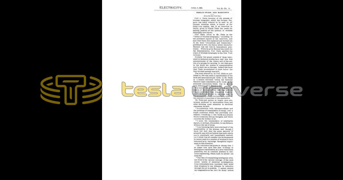 Nikola Tesla Articles Newspaper and magazine articles related to Nikola Tesla Tesla's Work and Marconi's Electricity April 9th, 1902 This article is a reprint from New York Sun of March 30, 1902 and is intentionally not duplicated here. Downloads Downloads for this article are available to members.Log in or join today to access all content. Downloads Downloads for this article are available to members.Log in or join today to access all content. Pagination Enjoy other articles First First item Previous Previous item Next Next item Last Last item Within the Universe Timeline Important moments and events related to Tesla. Articles Nikola Tesla in the press. Books Books written by and about Nikola Tesla. Documents Nikola Tesla documents, files and papers. Quotes Profound and insightful quotes by Nikola Tesla. Movies and TV Nikola Tesla on the screen. Patents Nikola Tesla held around 200 patents worldwide. Landmarks Locations related to Nikola Tesla. Images Nikola Tesla image and photo library. Show more Pagination Enjoy other articles First First item Previous Previous item Next Next item Last Last item Within the Universe Documents Nikola Tesla documents, files and papers. Quotes Profound and insightful quotes by Nikola Tesla. Books Books written by and about Nikola Tesla. Timeline Important moments and events related to Tesla. Patents Nikola Tesla held around 200 patents worldwide. Images Nikola Tesla image and photo library. Landmarks Locations related to Nikola Tesla. Letters Letters to, from and about Nikola Tesla. Movies and TV Nikola Tesla on the screen.