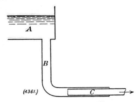 The efficiency of this device is easily calculated. Let !$v_0!$ be the absolute velocity of the fluid as it issues from D, and !$v_1!$ its final absolute velocity as delivered at the further end of the pipe E. Then if W be the weight of the water discharged per second, the change of momentum effected per second by the friction of the pipe is !$\frac{W}{g}(v_0 - v_1)!$. Hence the force F, which has acted on the fluid so as to change its momentum by this amount, is !$F = \frac{W}{g}(v_0 - v_1)!$, and since action and reaction are equal and opposite, this is also the propelling force which acts on the pipe. Hence, if the latter moves at the speed !$s!$, the useful work done per second will be !$Fs = \frac{W}{g}(v_0 - v_1) s!$.