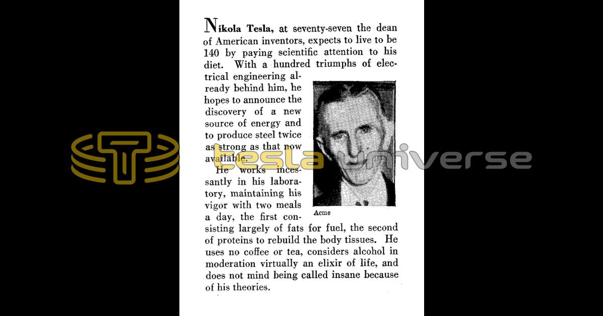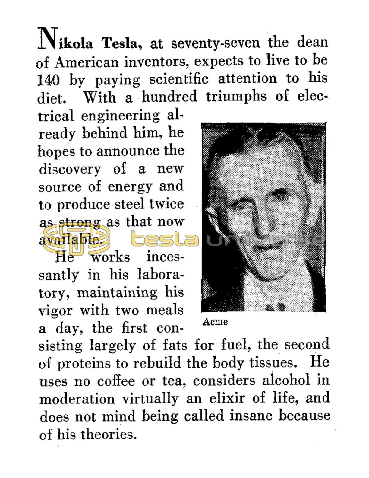 Nikola Tesla, at seventy-seven the dean of American inventors, expects to live to be 140 by paying scientific attention to his diet. With a hundred triumphs of electrical engineering already behind him, he hopes to announce the discovery of a new source of energy and to produce steel twice as strong as that now available. He works incessantly in his laboratory, maintaining his vigor with two meals a day, the first consisting largely of fats for fuel, the second of proteins to rebuild the body tissues. He uses no coffee or tea, considers alcohol in moderation virtually an elixir of life, and does not mind being called insane because of his theories.