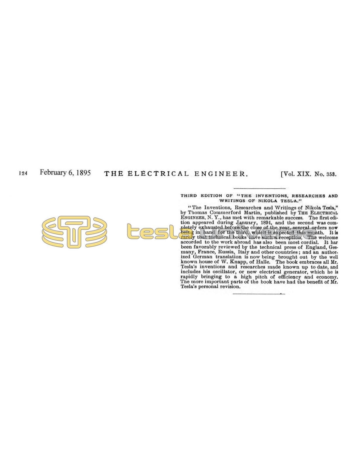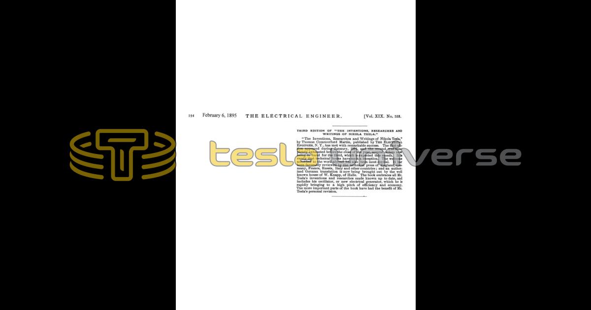 "The Inventions, Researches and Writings of Nikola Tesla," by Thomas Commerford Martin, published by The Electrical Engineer, N. Y., has met with remarkable success. The first edition appeared during January, 1894, and the second was completely exhausted before the close of the year, several orders now being in hand for the third, which is expected this month. It is rarely that technical books have such a reception, The welcome accorded to the work abroad has also been most cordial. It has been favorably reviewed by the technical press of England, Germany, France, Russia, Italy and other countries; and an authorized German translation is now being brought out by the well known house of W. Knapp, of Halle. The book embraces all Mr. Tesla's inventions and researches made known up to date, and includes his oscillator, or new electrical generator, which he is rapidly bringing to a high pitch of efficiency and economy. The more important parts of the book have had the benefit of Mr. Tesla's personal revision.