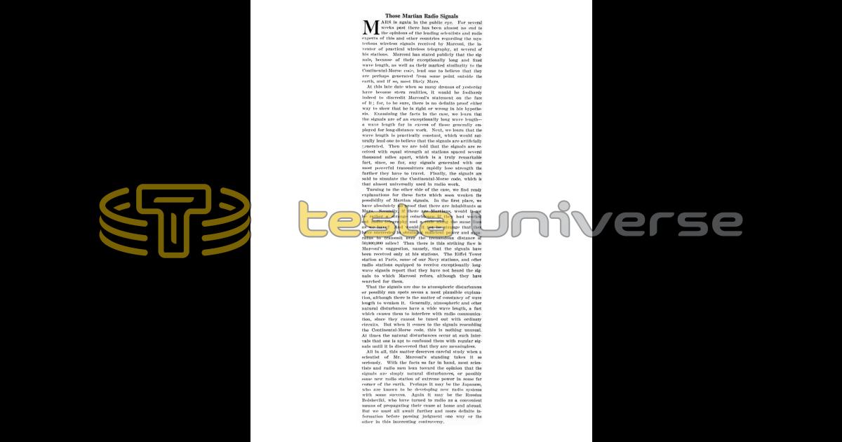 Mars is again in the public eye. For several weeks past there has been almost no end to the opinions of the leading scientists and radio experts of this and other countries regarding the mysterious wireless signals received by Marconi, the inventor of practical wireless telegraphy, at several of his stations. Marconi has stated publicly that the signals, because of their exceptionally long and fixed wave length, as well as their marked similarity to the Continental-Morse code, lead one to believe that they are perhaps generated from some point outside the earth, and if so, most likely Mars.