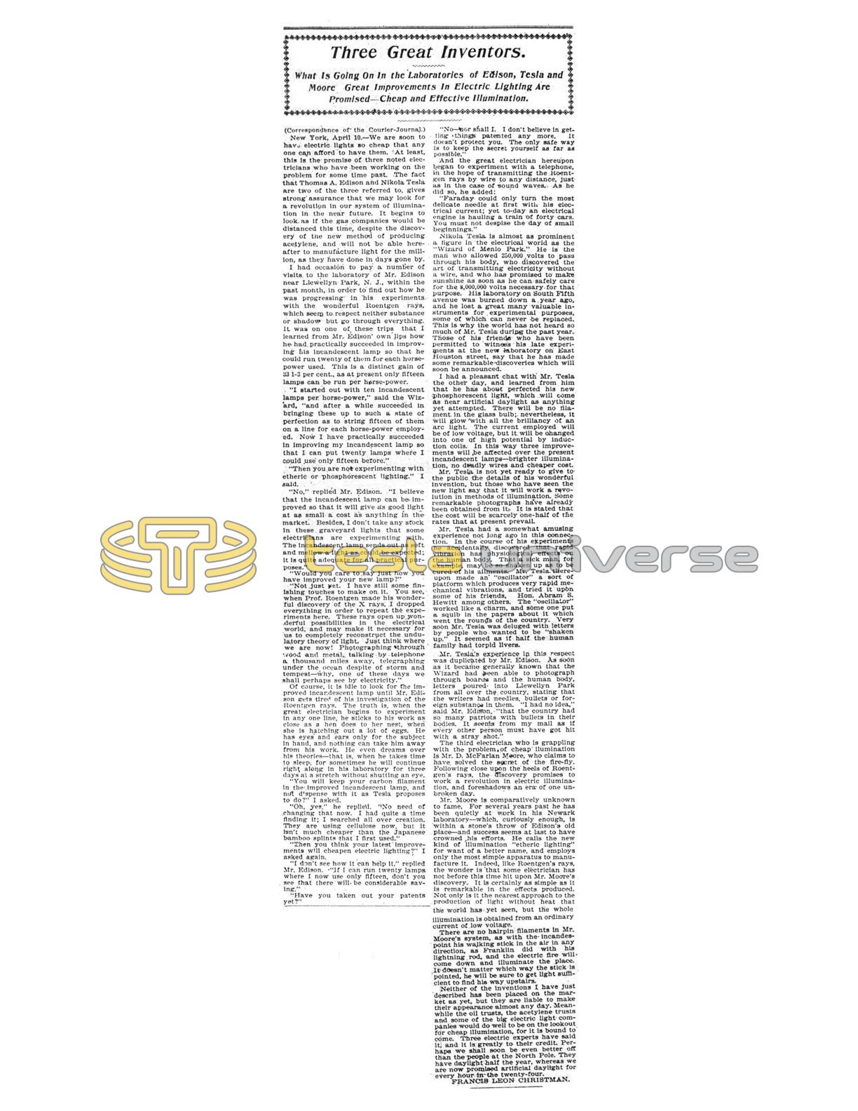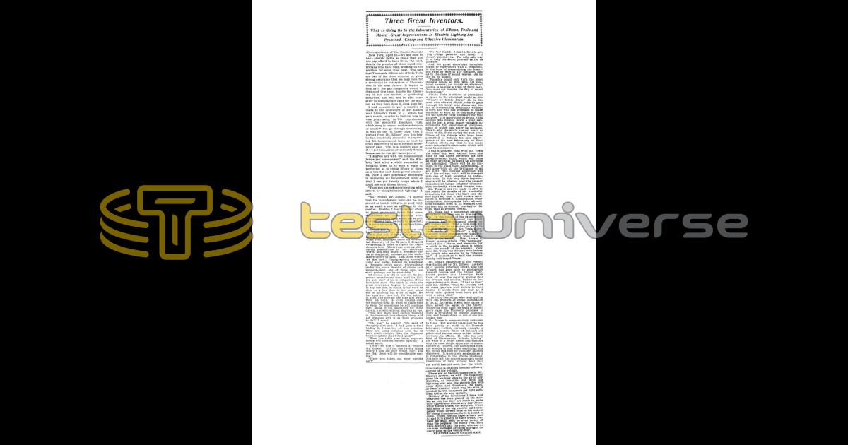 New York, April 10. — We are soon to have electric lights so cheap that any one can afford to have them. At least, this is the promise of three noted electricians who have been working on the problem for some time past. The fact that Thomas A. Edison and Nikola Tesla are two of the three referred to, gives strong assurance that we may look for a revolution in our system of illumination in the near future. It begins to look, as if the gas companies would be distanced this time, despite the discovery of the new method of producing acetylene, and will not be able hereafter to manufacture light for the million, as they have done in days gone by.