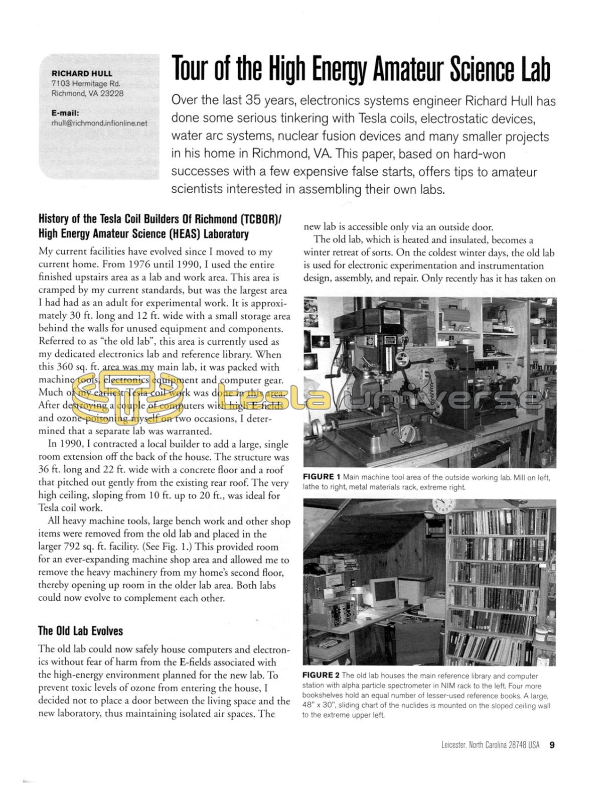 Over the last 35 years, electronics systems engineer Richard Hull has done some serious tinkering with Tesla coils, electrostatic devices, water arc systems, nuclear fusion devices and many smaller projects in his home in Richmond, VA. This paper, based on hard-won successes with a few expensive false starts, offers tips to amateur scientists interested in assembling their own labs.