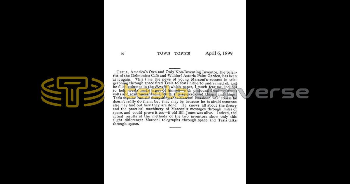 Tesla, America’s Own and Only Non-Inventing Inventor, the Scientist of the Delmonico Café and Waldorf-Astoria Palm Garden, has been at it again. This time the news of young Marconi’s success in telegraphing through space fired Tesla to feats hitherto undreamed of, and he filled columns in the Herald - which paper, I much fear me, inclines to help Tesla make a guy of himself - with profound droolings about volts and resistances and circuits and ampères and things and things. Tesla says he can do everything that Marconi has done. Of course he doesn’t really do them, but that may be because he is afraid someone else may find out how they are done. He knows all about the theory and the practical machinery of Marconi’s messages through miles of space, and could prove it too - if old Bill Jones was alive. Indeed, the actual results of the methods of the two inventors show only this slight difference: Marconi telegraphs through space and Tesla talks through space.
