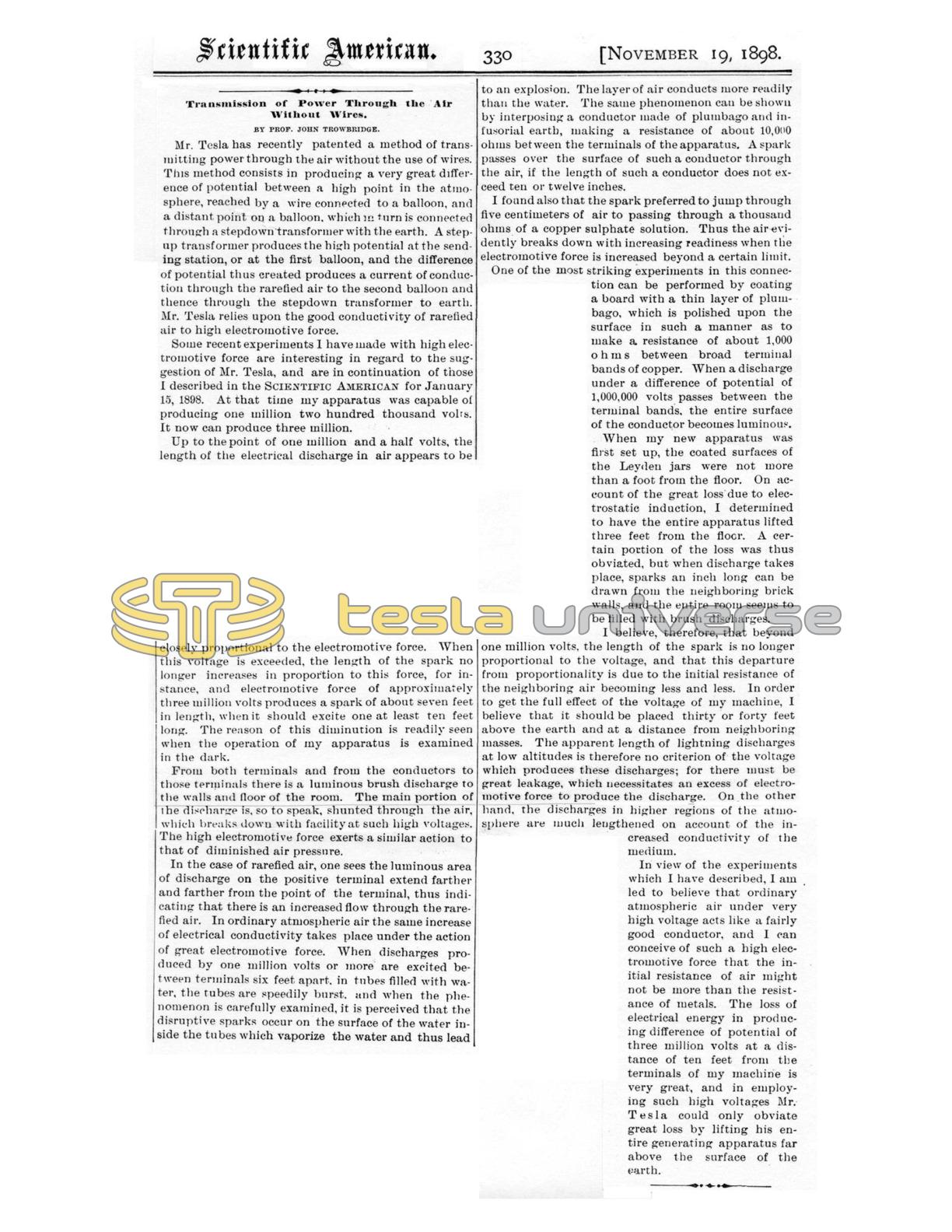 In view of the experiments which I have described, I am led to believe that ordinary atmospheric air under very high voltage acts like a fairly good conductor, and I can conceive of such a high electro motive force that the initial resistance of air might not be more than the resistance of metals. The loss of electrical energy in producing difference of potential of 3,000,000 volts at a distance of 10 feet from the terminals of my machine is very great, and in employing such high voltages Mr. Tesla could only obviate great loss by lifting his entire generating apparatus far above the surface of the earth.