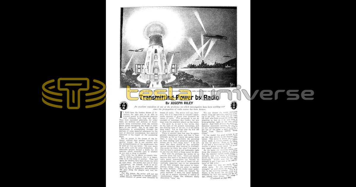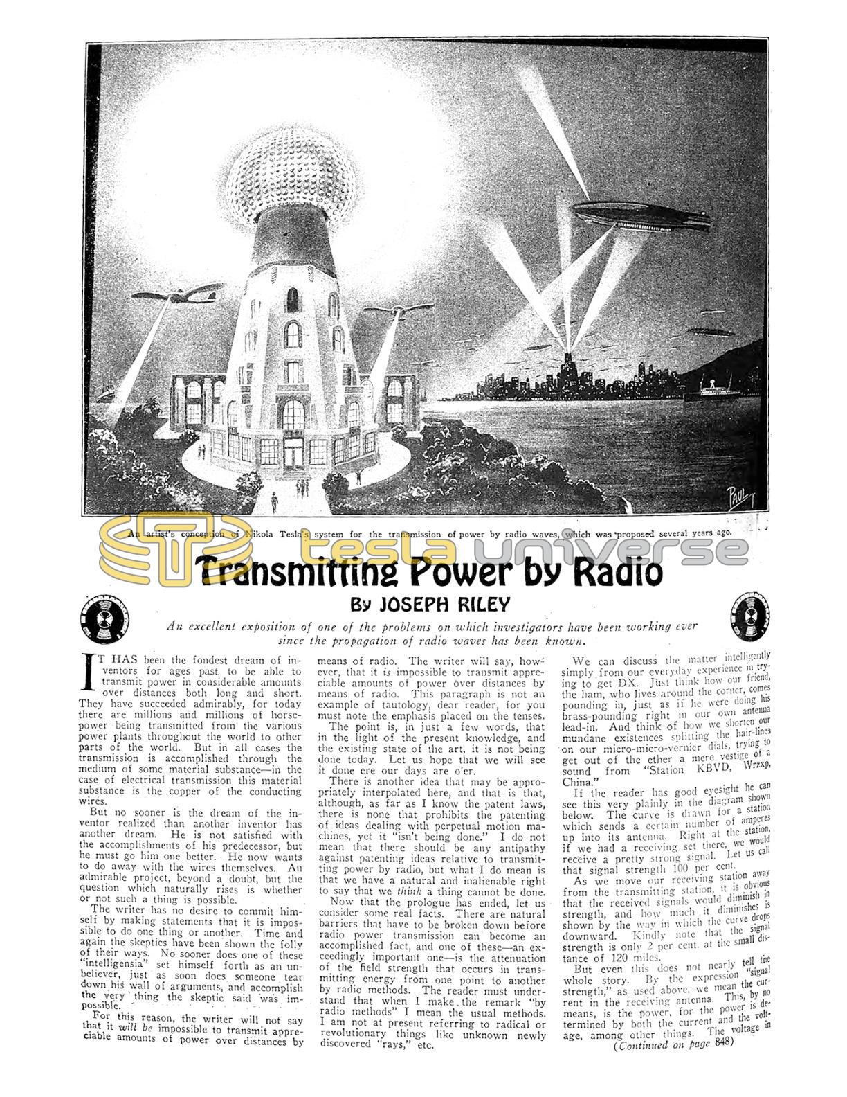 Those who have followed the advances in the radio field for the last decade will remember the experiment carried out on the plains of Colorado, in which Tesla success- fully heated the filament of an ordinary electric lamp on a small loop of wire from power generated several miles away and transmitted from the generating plant to the light through space without intervening conductors of any kind.